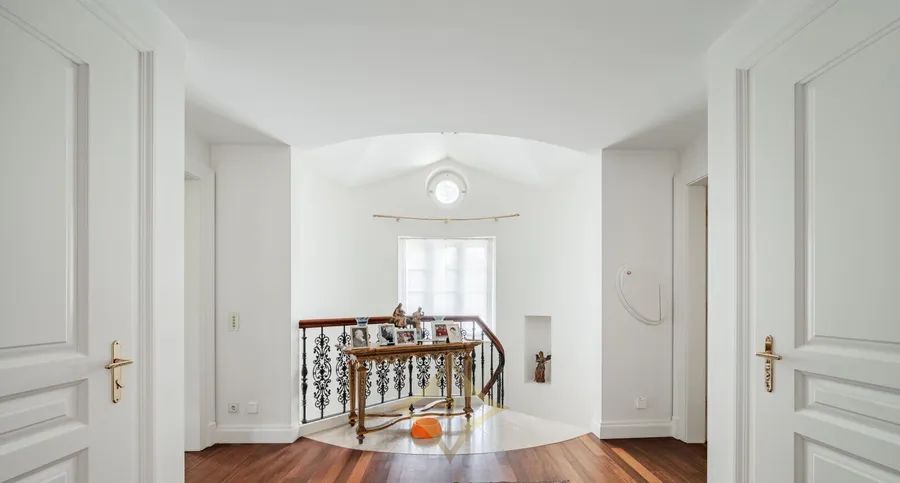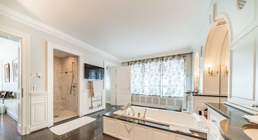 The living levels of this extraordinary villa are connected by an internal elevator. On the ground floor, you enter the representative entrance, where the elegant furnishing style of the house is already reflected. Opposite is the approximately 25 m² large dining room, which has been furnished in warm, harmoniously coordinated colors and offers a view into the adjoining garden through the floor-to-ceiling glass doors. On this level, to the right, you will also find a generous cloakroom with a guest toilet as well as the fully equipped kitchen with an island. From here, you can access an extensive rear terrace that invites you to dine and relax outdoors. To the left, you enter the cozy salon with an open fireplace. This living space, with a total size of approximately 53 m², is again flooded with daylight through an almost seamless window front. The adjacent library radiates special warmth due to its Swiss pine wood paneling. A terrace with views of greenery and the swimming pool extends here across the entire length.