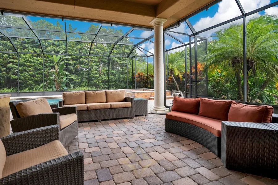 Outdoors, a private, screened, and south-facing pool deck offers a sense of seclusion surrounded by mature landscaping on an oversized lot of just under one acre. Architectural details such as crown molding, tray ceilings, and wood or tile floors throughout enhance the home’s timeless appeal.