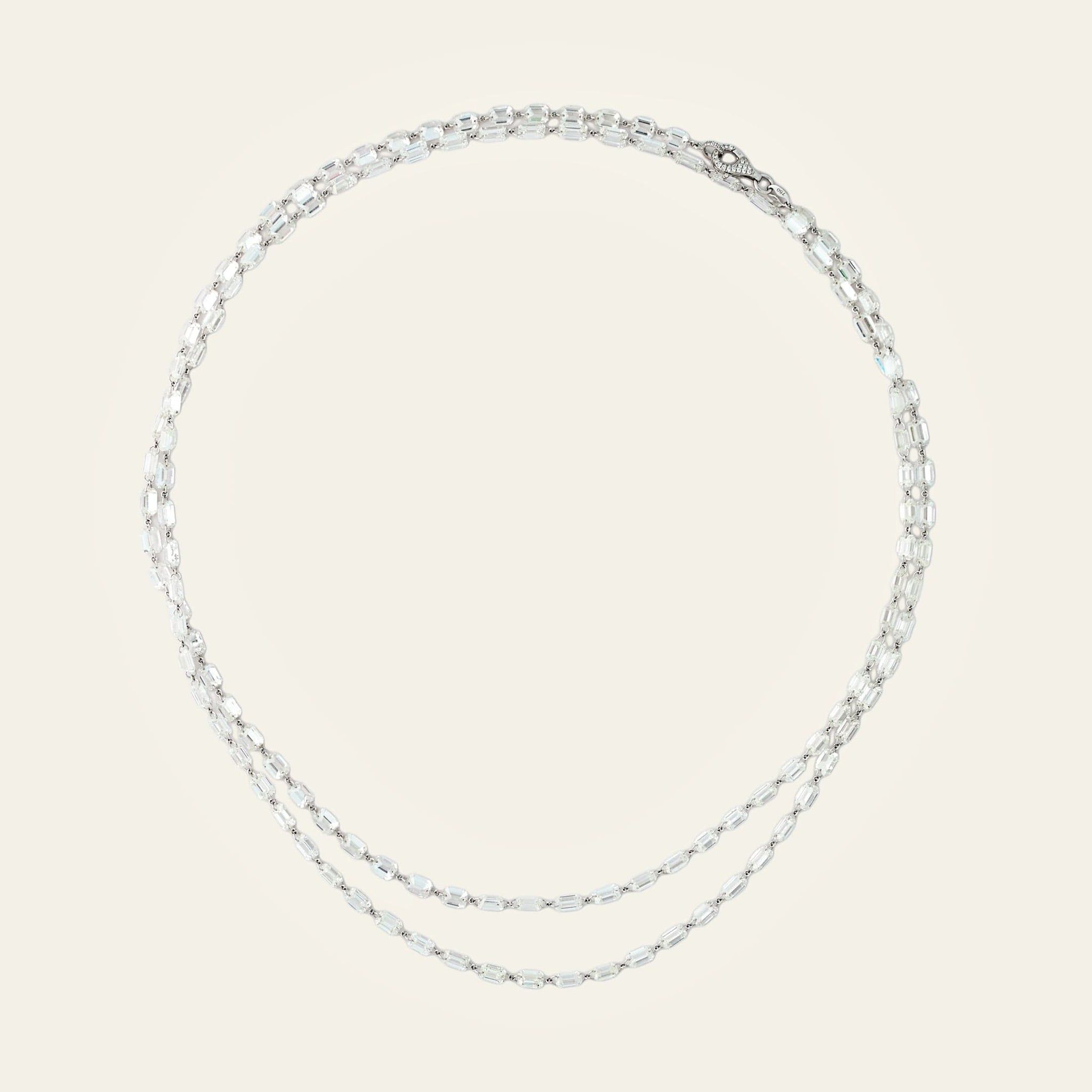 This extraordinary diamond rope necklace is designed to move like liquid light around the neckline. Featuring a continuous strand of emerald cut diamonds each stone is perfectly matched to create a seamless and fluid silhouette that drapes effortlessly across the body. The elongated rectangular facets catch the light from every angle giving the necklace its signature mirror like brilliance and modern glamour. Finished with a pavé set clasp this piece offers both high jewelry craftsmanship and refined class.