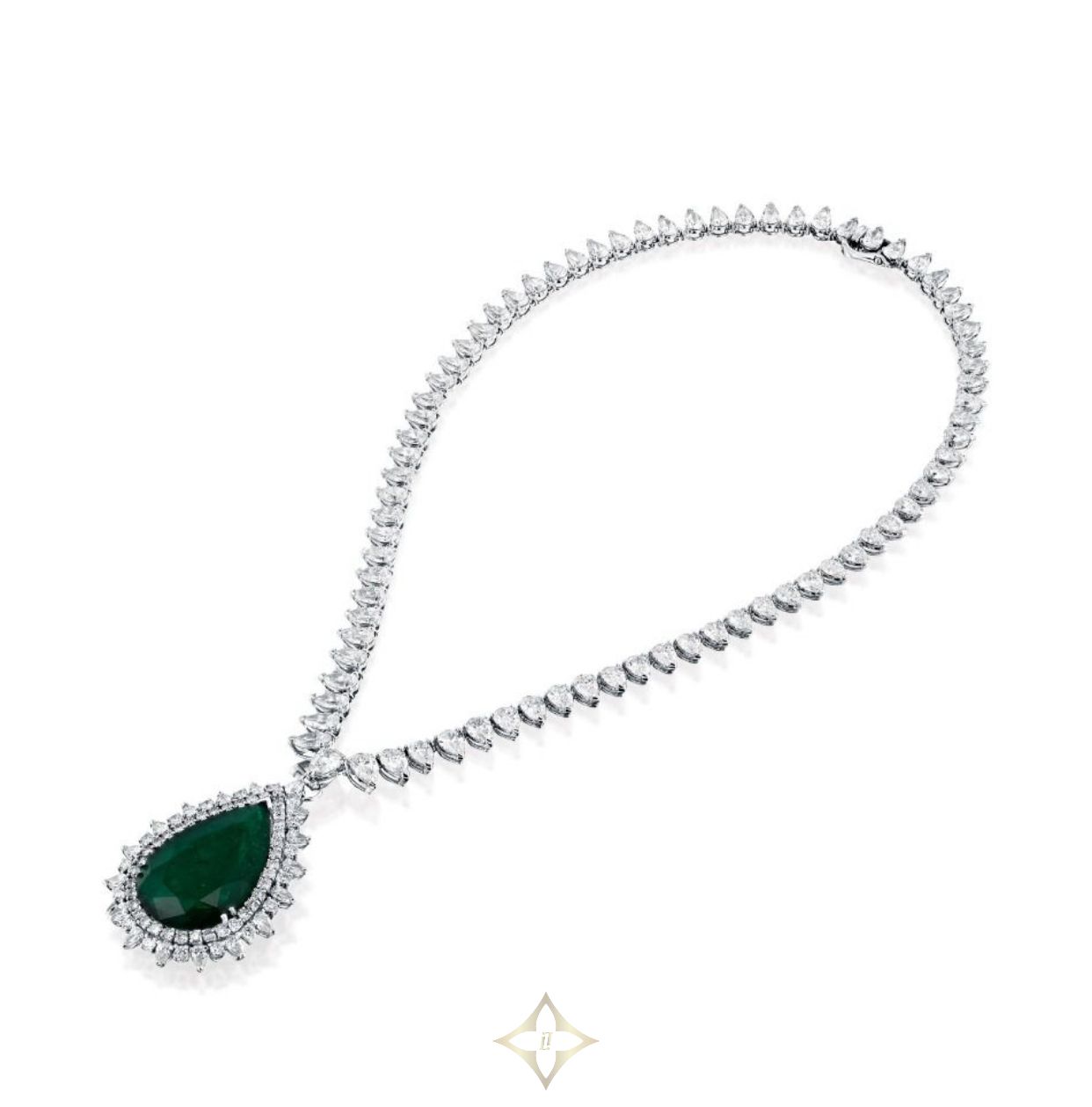 Emerald necklace in 18K white gold set with a green emerald of 24.53 CT and diamonds of 38.33 CT.