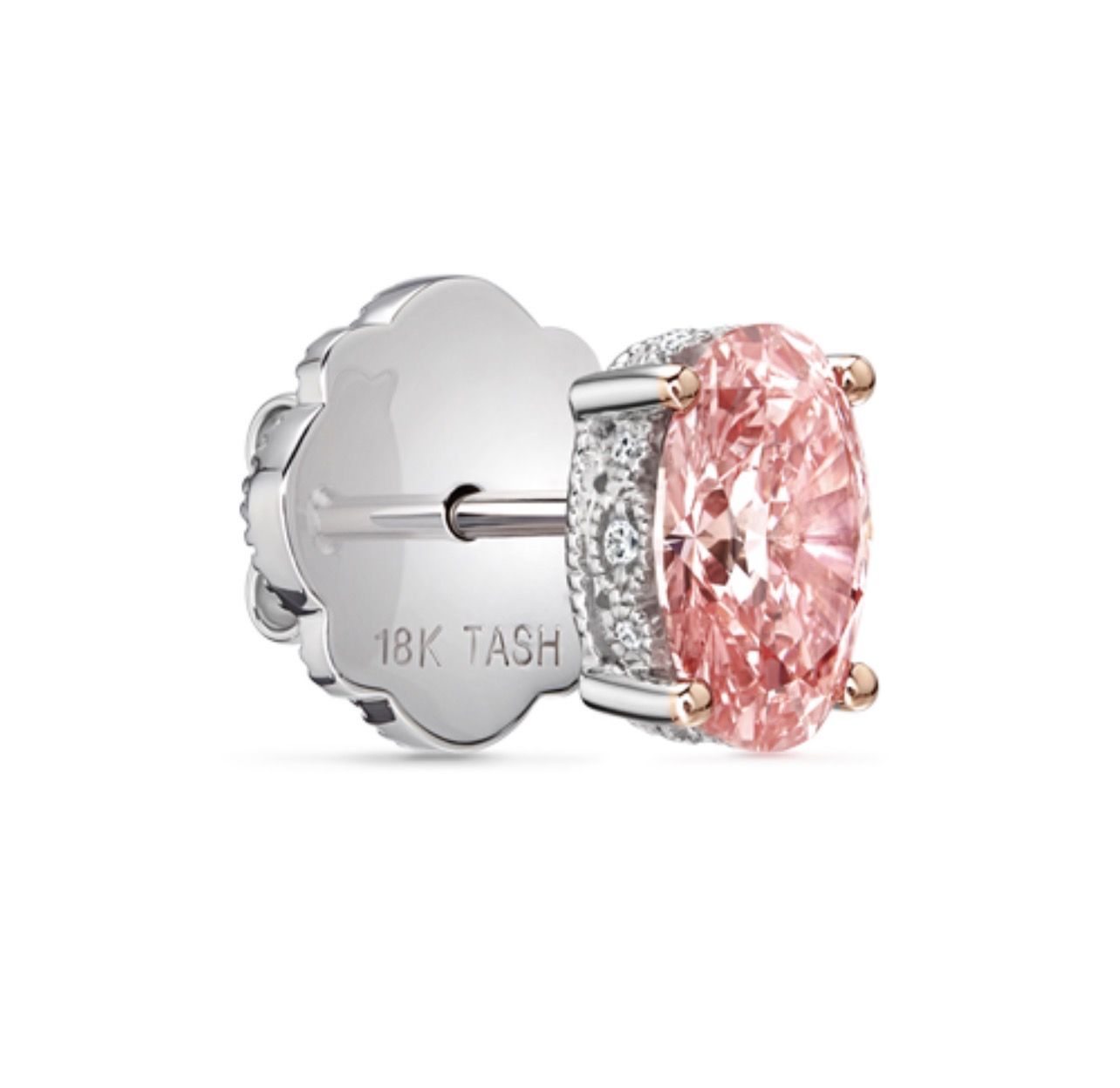 A stunning large pink oval diamond stud in solid gold with four rose gold prongs that enhance the diamond hue while remaining discrete. A classic, engraved milgrain and round diamond setting adds a layer of detail visible from the side.