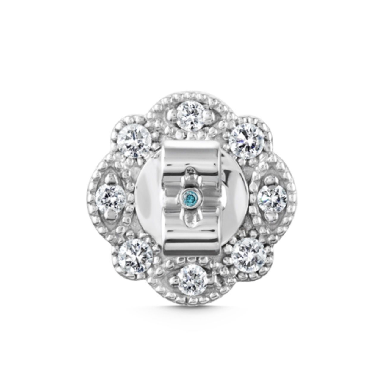 Perfect for the Lobe, the traditional post is complete with a microset blue diamond at the end to resemble the stamen of a flower. A diamond rosette butterfly backing featuring eight diamonds ensures shine from all angles.