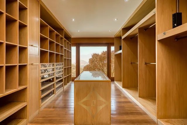 From the hall, half a level up, there is a study and the master bedroom suite with 2 large walk-in closets overlooking the landscape.