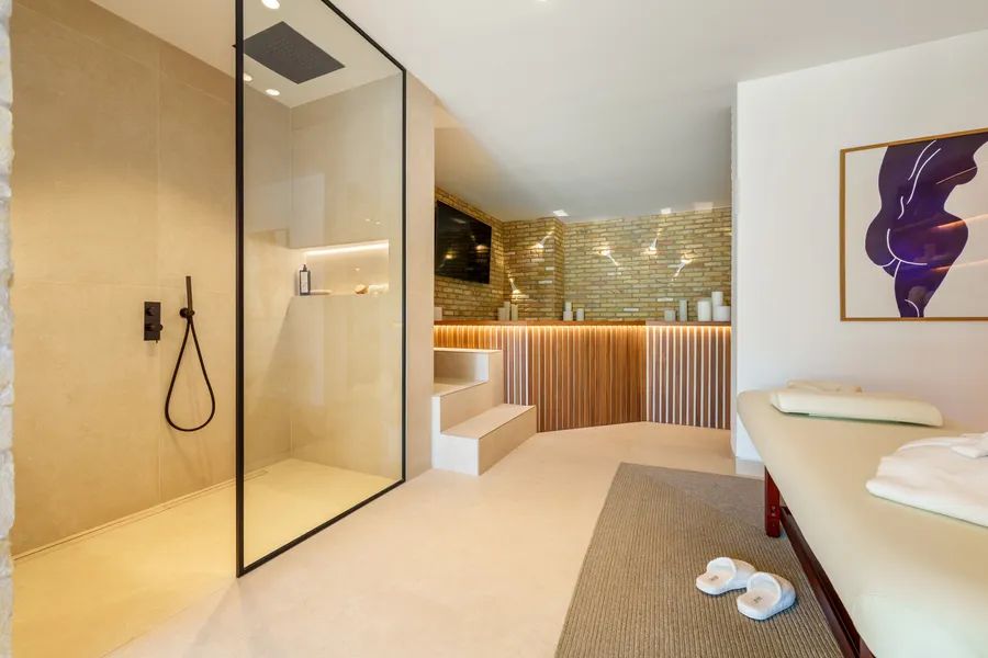 Outdoor living is equally impressive. A private saltwater swimming pool is surrounded by a sunny south-facing terrace, complete with lounge areas, a fully equipped outdoor BBQ kitchen, and an elegant chill-out zone — perfect for enjoying the Mediterranean climate and entertaining family and friends.