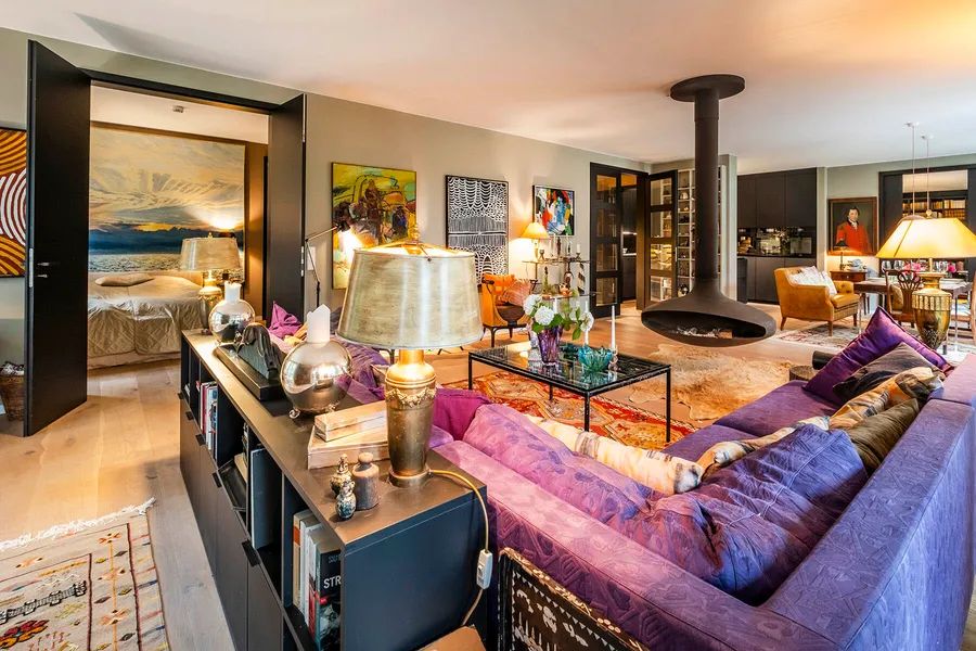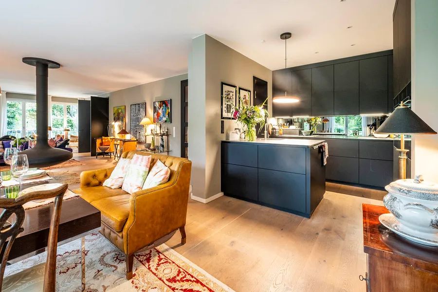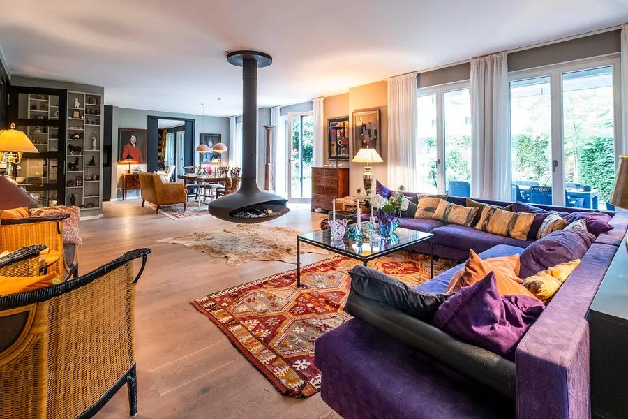 The heart of the apartment is the open-plan living area of approx. 60 sqm with a free-hanging fireplace as a real eye-catcher. A spacious window front provides a magnificent view of the evergreen south-facing garden.