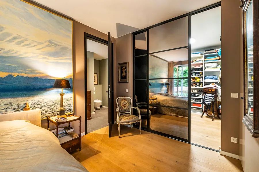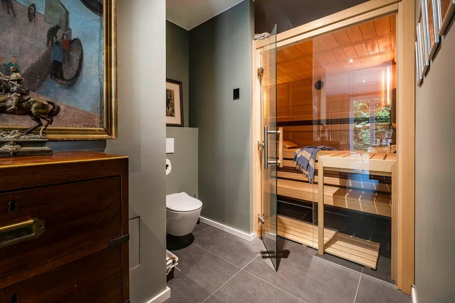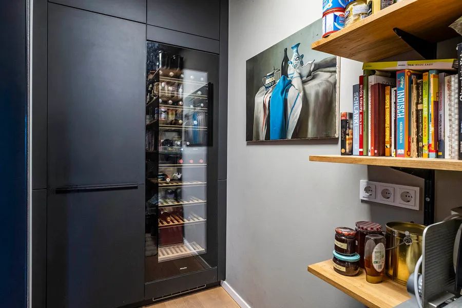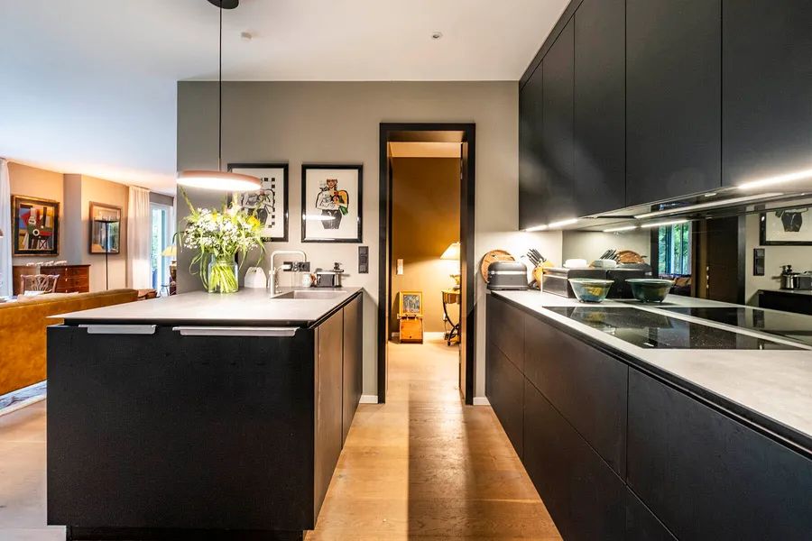 Adjacent to the dining area is the modern, elegant kitchen – a well-designed cooking retreat with state-of-the-art technology – equipped with high-quality Miele appliances, including a hot water Quooker, a built-in professional coffee machine, a steam cooker, and a combination oven. An exceptional work surface made of rolled stainless steel and an adjacent practical pantry with an extra-large refrigerator and wine cooler perfectly round off the high functionality of this exclusive kitchen.