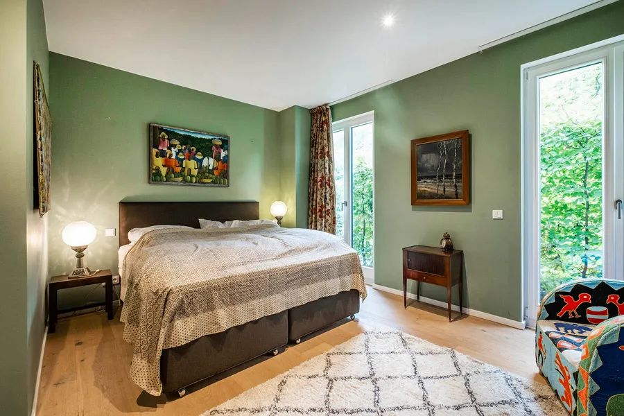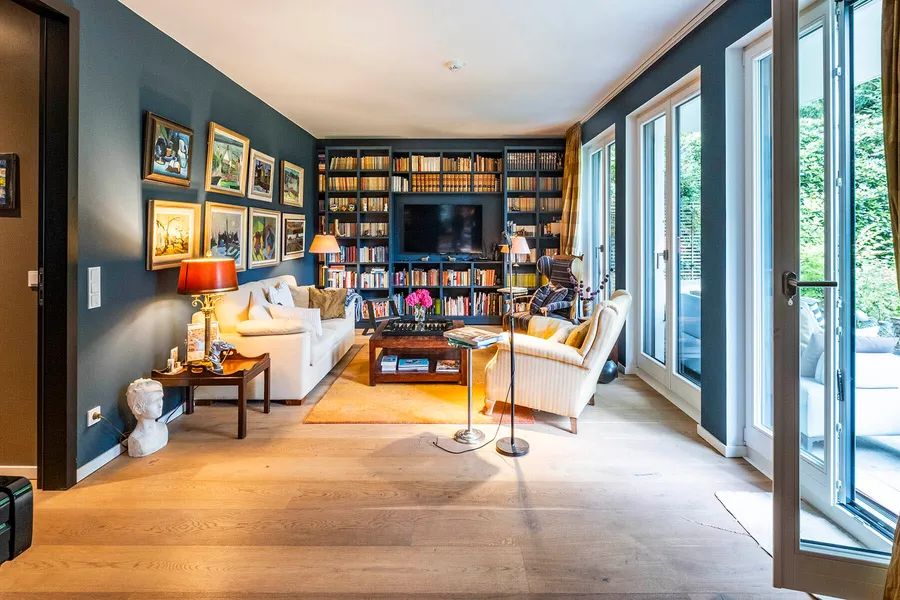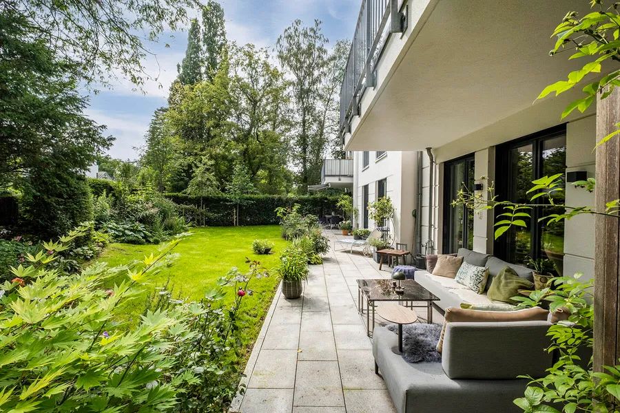 The modern and stylishly furnished apartment has floor-to-ceiling windows in all rooms, which provide the spacious rooms with natural light. The approximately 60 sqm south-facing terraces lead to the lovingly landscaped private garden, which belongs to the apartment through exclusive rights of use. In addition to a dining and lounge area, the garden offers plenty of outdoor comfort and gives this property a house-within-a-house feeling. Part of the terraces is also equipped with a high-quality awning, offering sheltered comfort even on sunny days. A small wooden tool shed also provides additional space for garden tools and bicycles. A robotic lawn mower has been installed to ensure that the lawn is always well maintained.