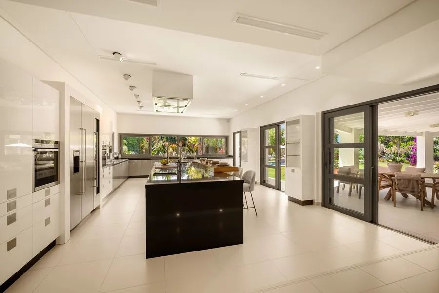 The villa features a wraparound covered terrace, perfect for year-round outdoor living. Inside, the home boasts an entrance hall with garden, a lounge opening onto the terrace and garden, a stunning open-plan professional Danespan kitchen with a large central island and 2 dining areas.