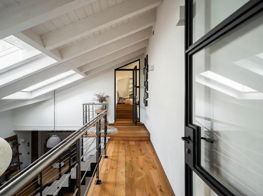 The highlight of the penthouse: the charming Torretta, a private shelter with large windows on three sides. From here you can enjoy an unparalleled panoramic view of the roofs of Menaggio, Lake Como and