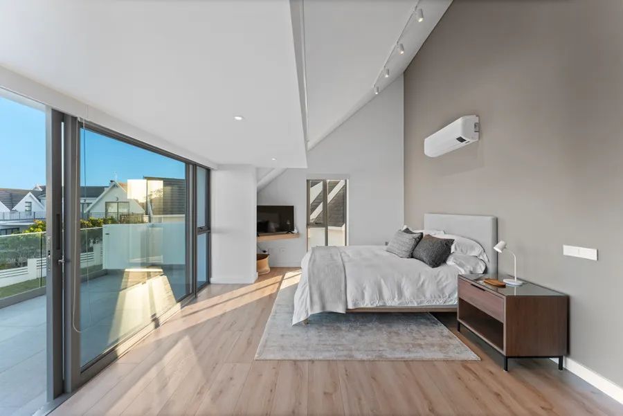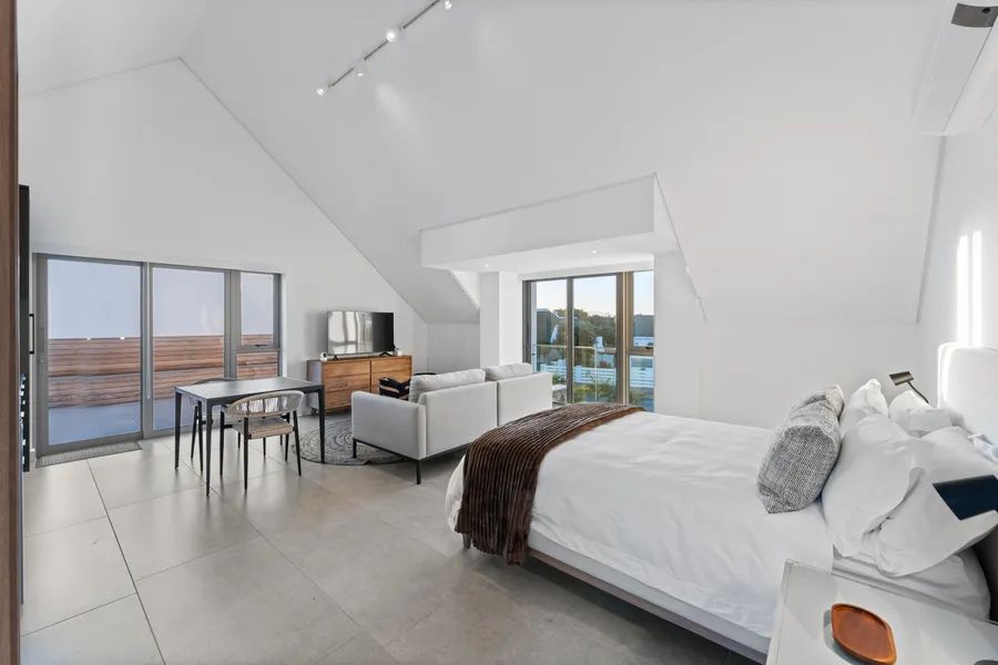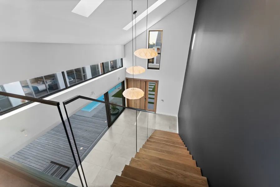 The heart of the home is the expansive open-plan kitchen, dining, and living area, defined by high ceilings, clean lines, and an abundance of natural light. This inviting space opens onto a wind-protected outdoor entertainment area with a sparkling pool—perfect for relaxed gatherings year-round. Three en suite bedrooms are thoughtfully positioned on the ground level for convenience and privacy.