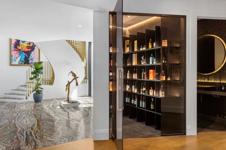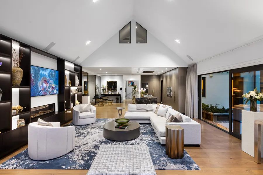 Outdoors, a loggia with swing seat overlooks the pool and waterfall, while the BBQ pavilion with bar and fireplace ensures entertaining is effortless and the wellness centre is a destination in itself, offering a sauna, steam room, gym, and yoga space for restorative living,