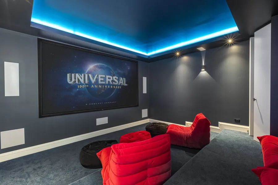Two main pavilions rise to soaring double-height ceilings, with spaces that balance intimacy and grandeur and the formal dining room, framed by smoked glazed doors, sets the scene for elegant evenings, while the Grand Lounge evokes a ballroom with parquet floors and a striking stone fireplace.