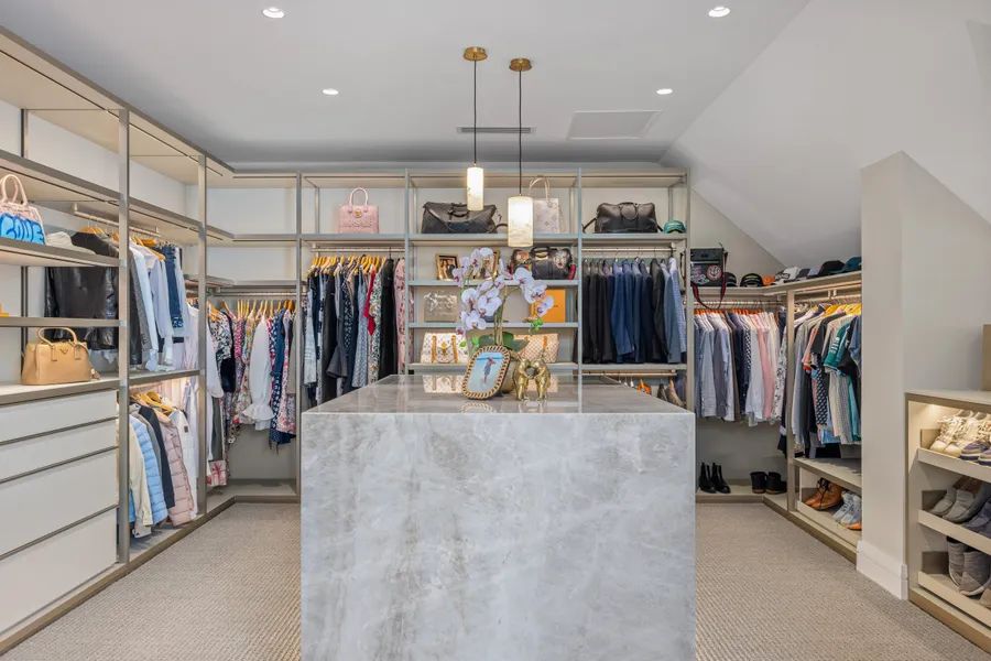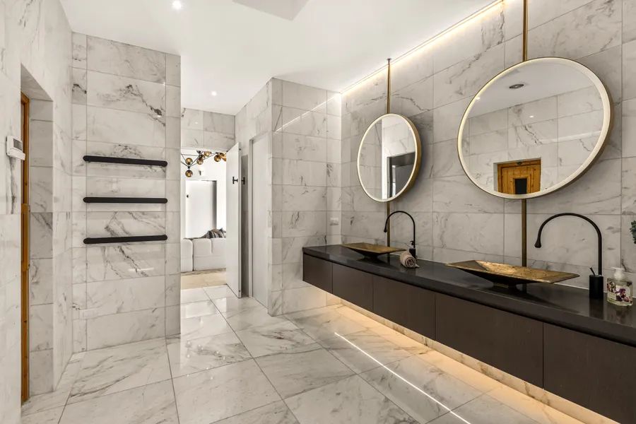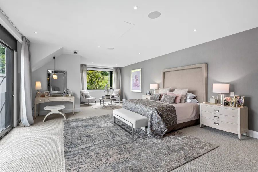 The master suite is a retreat, with a spa-inspired ensuite and a Poliform walk-in wardrobe centred on a couture-style stone island. A lounge and balcony add further indulgence.