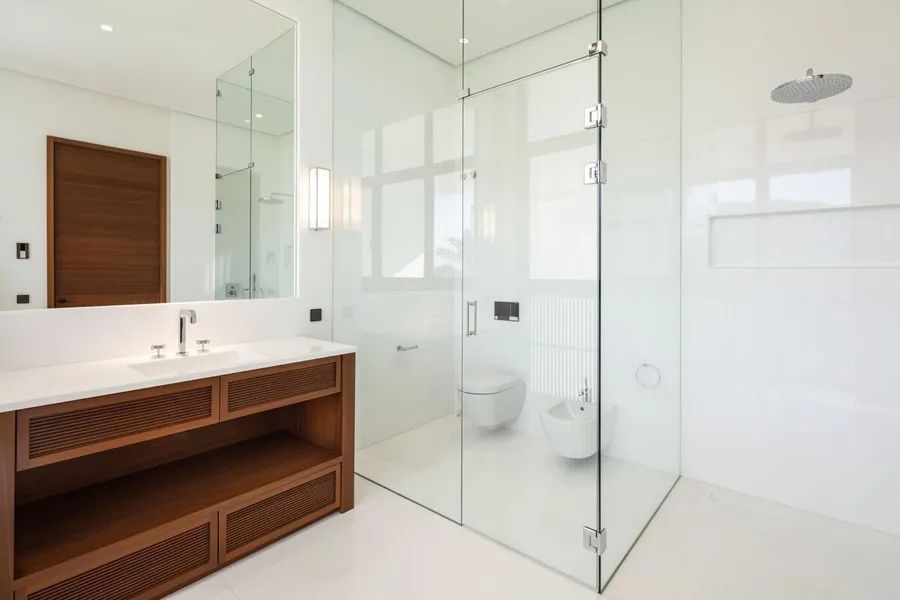 The property showcases an abundance of floor-to-ceiling windows that grace both levels, allowing natural light to flood the interiors. Its striking white facade, embellished with wooden accents, sets the tone for a seamless transition between the exterior and interior spaces. Of particular note is the impressive ceiling height, soaring to an astonishing 9 metres in the ground-level living area.