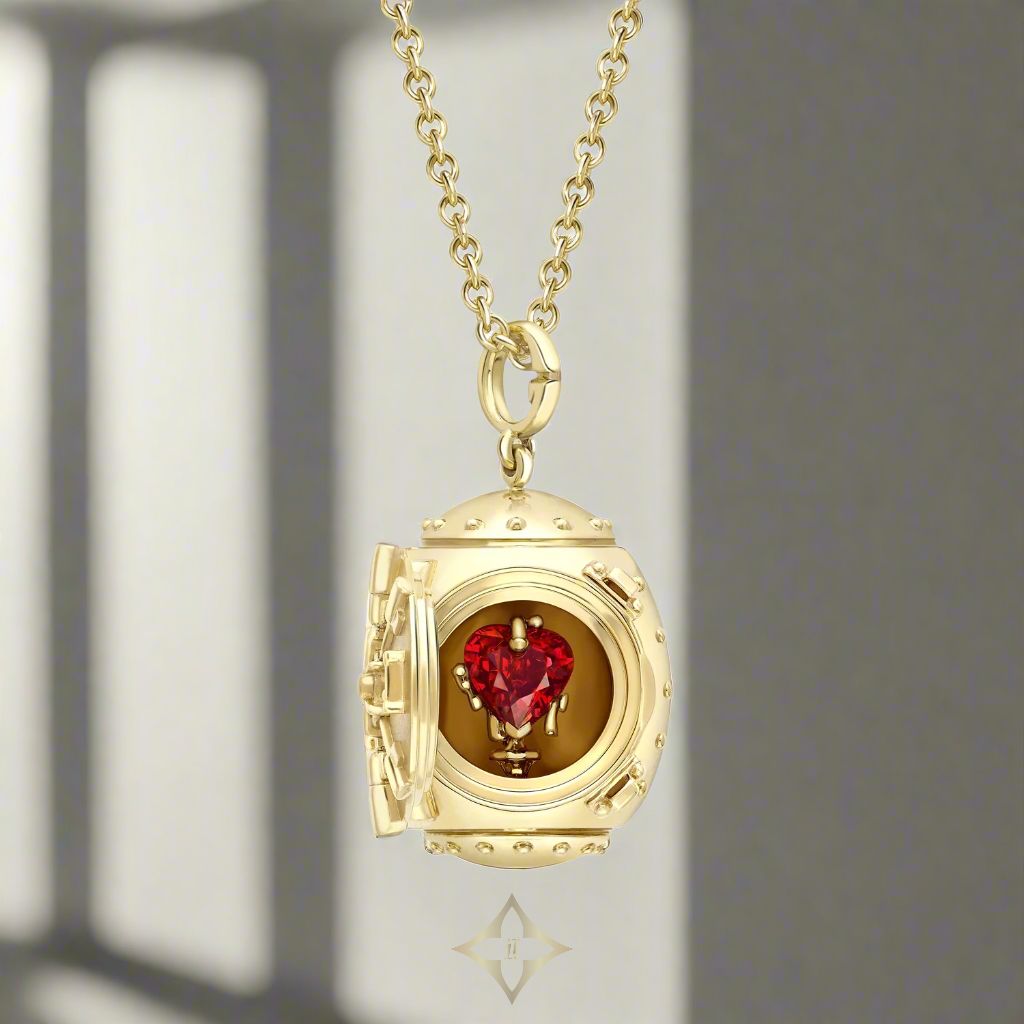 Details. Made from the finest precious materials: 18k yellow gold and a Gemfields heart-shaped Mozambique ruby. The locket hangs on a 60cm long 18k yellow gold 1.9mm trace chain with egg tag.