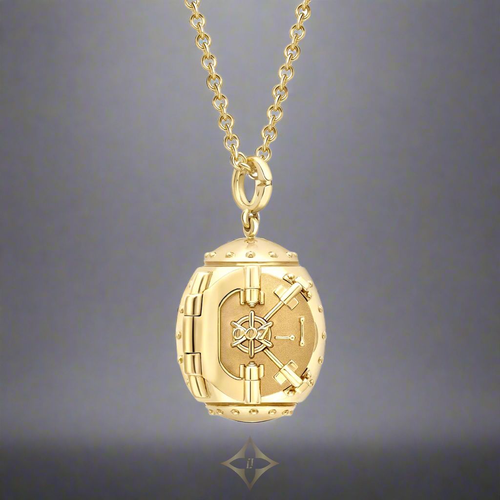 The exterior. Meticulously crafted in 18k yellow gold, the curved egg shape is based on a heavily armoured and studded vault, complete with hinged doors and spinning central handle. At the centre is a 007 and the bail is in the shape of a G for Goldfinger, in the same font as Auric's ring from the film.