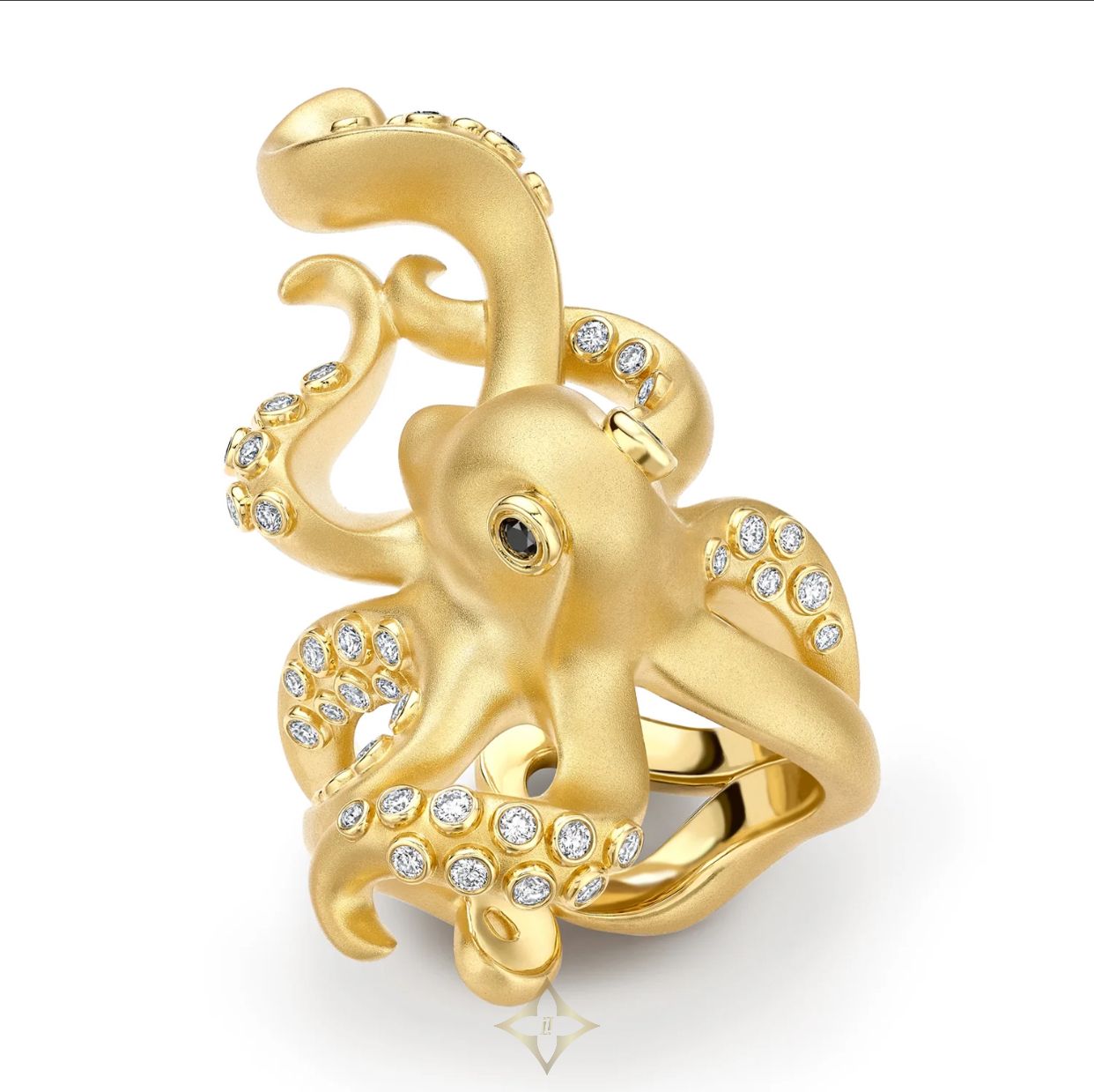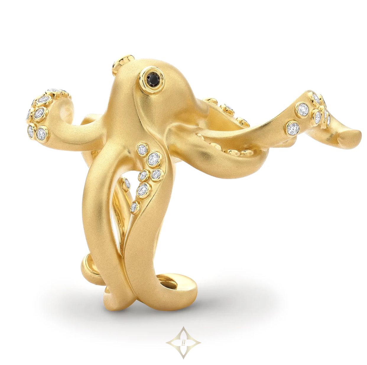 Details. Continuing the series of Fabergé x 007 pieces taking inspiration from Octopussy.This elegant, statement ring is crafted in yellow gold with a brushed finish and features a distinctive octopus design that wraps around the finger. Forty-eight round brilliant-cut white diamond 'suckers' stud the tentacles, while two round brilliant cut black diamonds give character to the eyes. In keeping with Fabergé’s signature element of surprise, a responsibly mined Gemfields Mozambican ruby is set hidden on the inside of the ring band, a secret only the wearer will know. Gem details below: