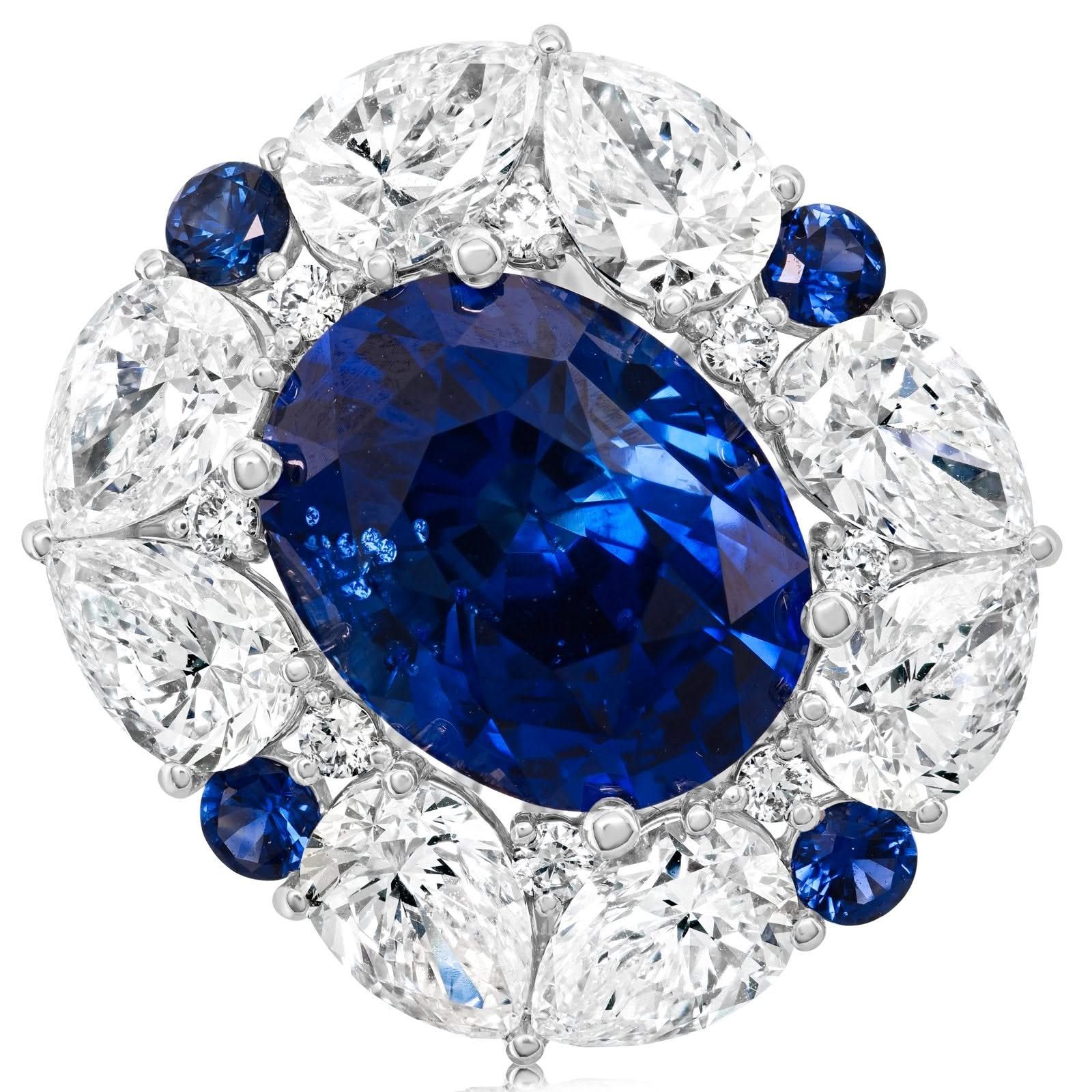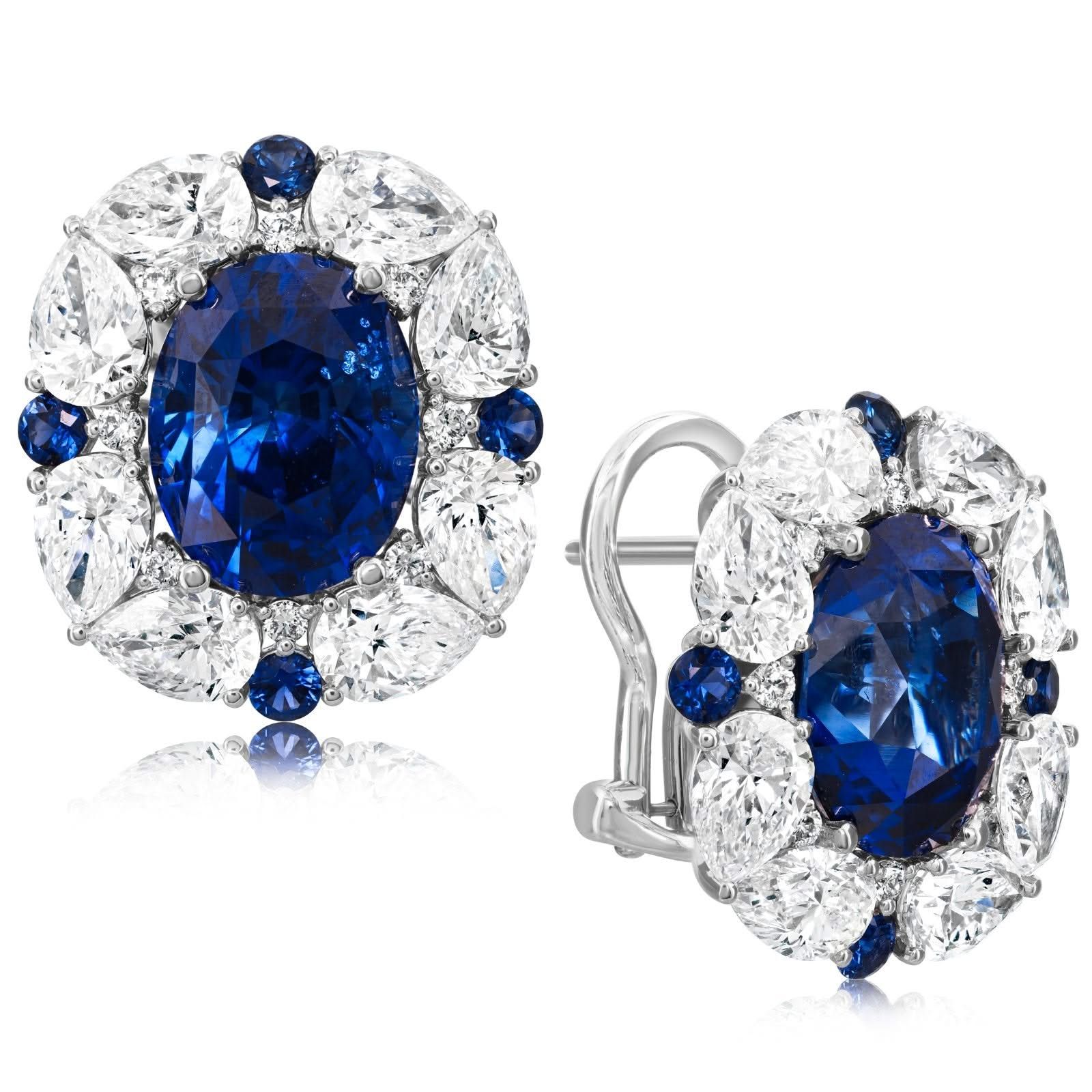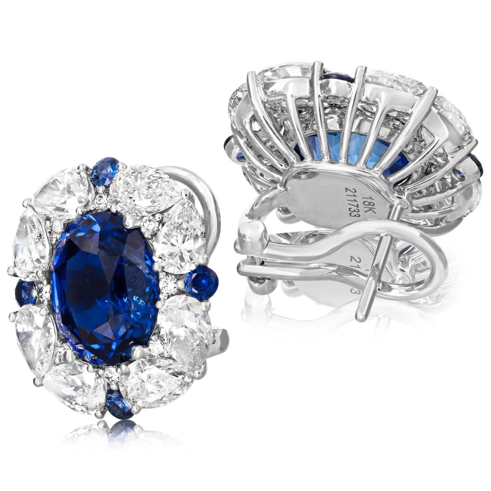 18K white gold sapphire and diamond halo earrings from the Reis-Nichols Collection. The earrings feature two oval sapphires weighing 4.79 ctw, eight round sapphires weighing .51 ctw and 32 round and pear shape diamonds weighing 5.20 ctw.
