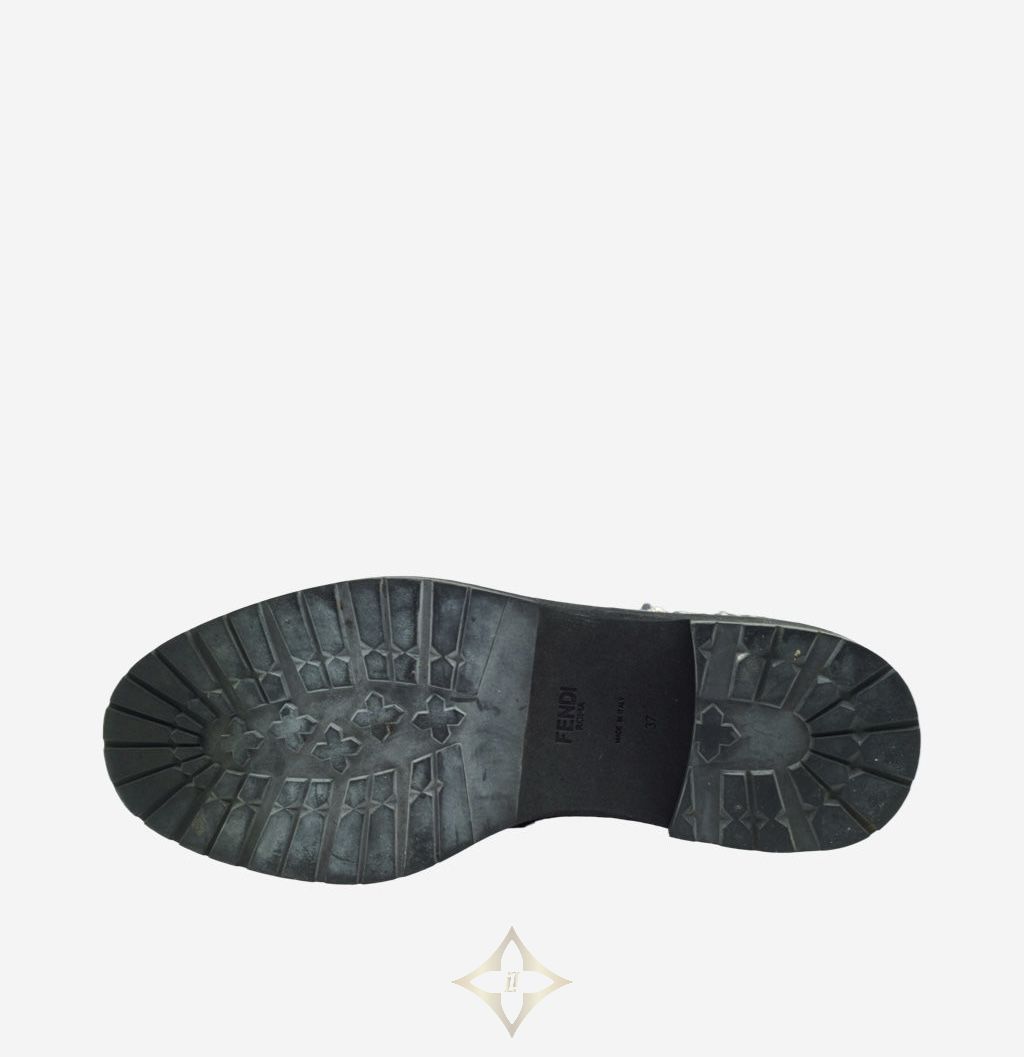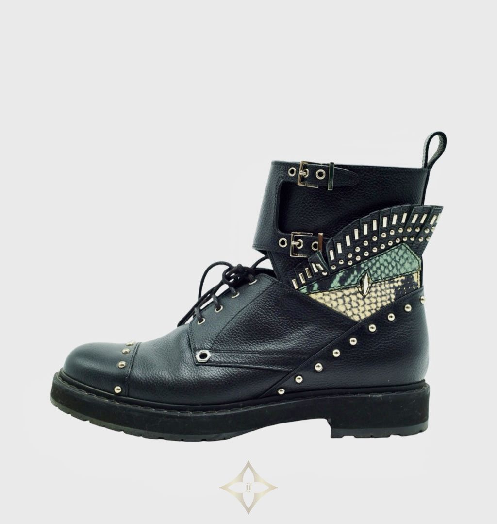 Description: Fendi boots in black leather, oval toe, lace-up closure and metal snaps on the sides, animal print panels and studs, silver-tone hardware
