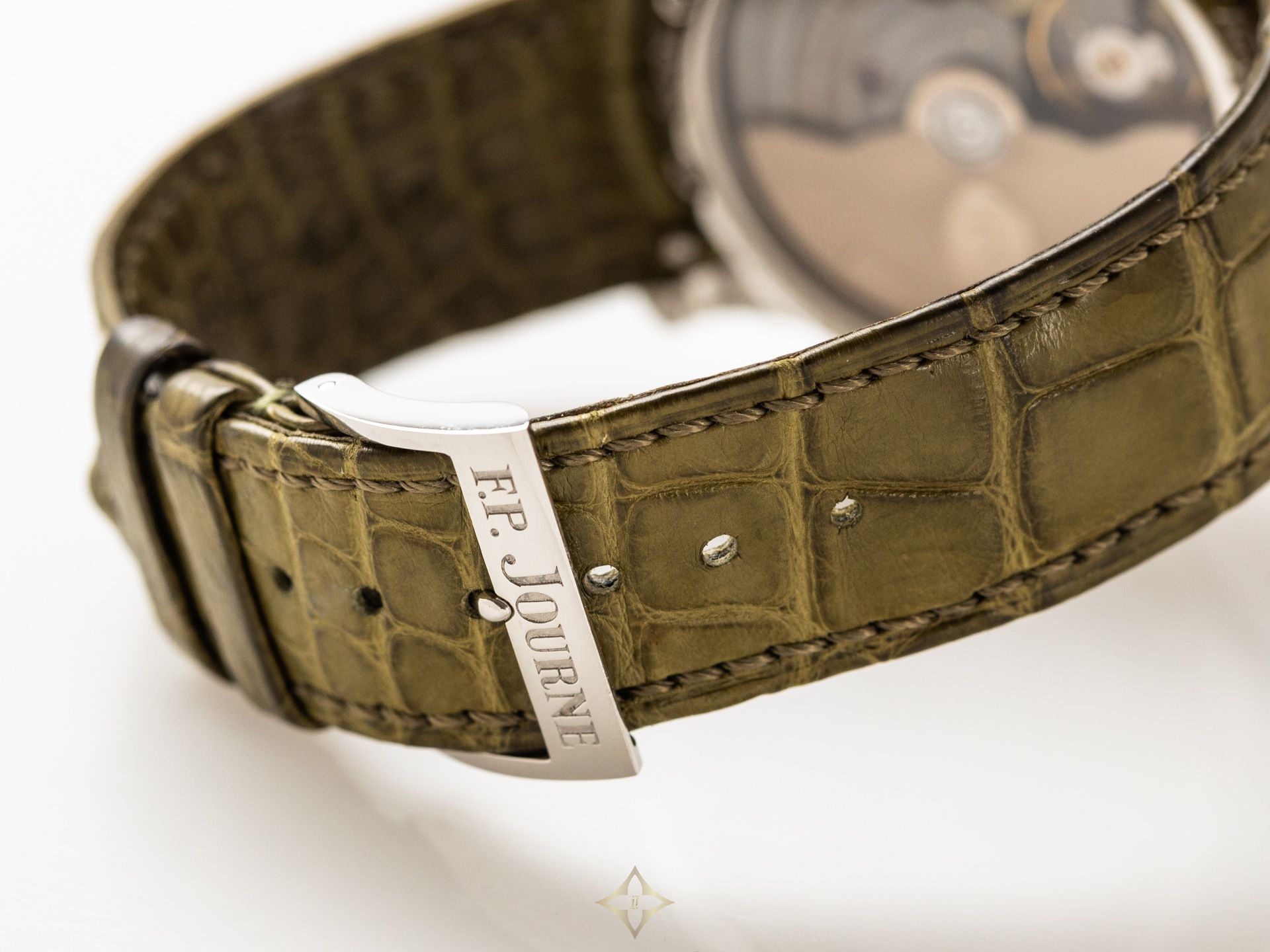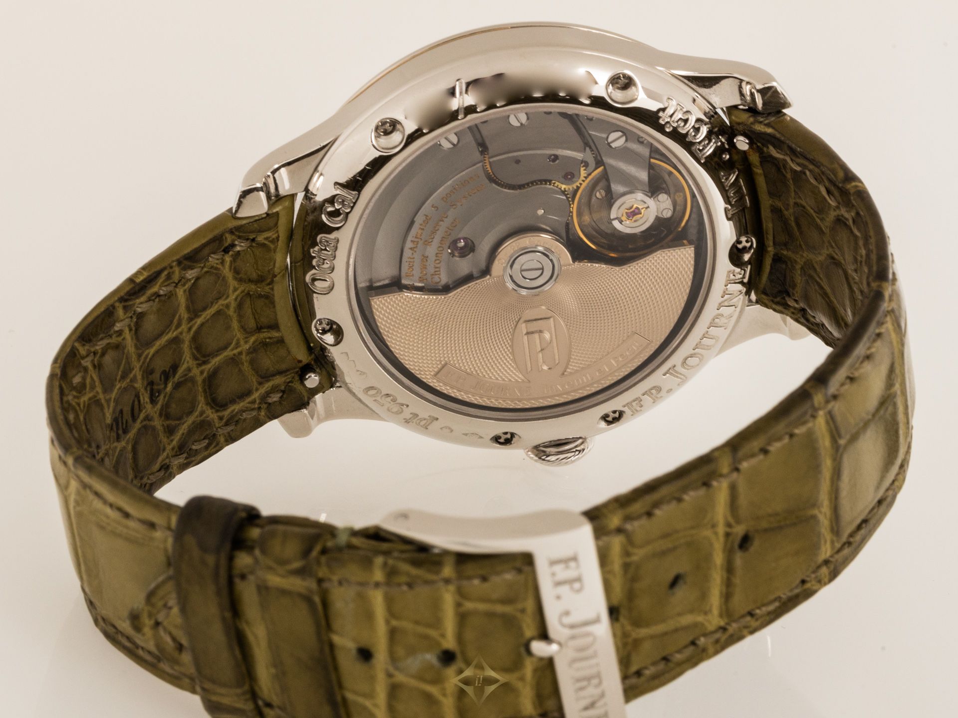 F.P.Journe OCTA CALENDRIER RUTHENIUM Dial F-P-Journe OCTA CALENDRIER Ruthenium Dial 950 Platinum Limited 99 Pieces Papers Bj-2004 PRICE: € 325,000 Data Reference CALENDRIER Code K22149 Condition Very good With papers Year of production 2004 Property of Bachmann & Scher GmbH Description Case material Platinum Case diameter 40 Glas Sapphire glass Clasp Buckle Clasp material Platinum Dial Grey Dial numbers Arabic numerals Bracelet material Crocodile skin Caliber FPJ 1300/ 21k gold rotor Movement Automatic Features Date, Weekday, Month Miscellaneous High-End, Small Seconds, Blue Steel Hands, Limited Edition, Quick Set, Only Original Parts Our remarks We are more than proud to offer you this more than excellent and unpolished F.P.Journe OCTA CALENDRIER in 950 platinum with a green FPJ croco strap and 950 platinum pin buckle. Coming with the original warranty certificate and describtion booklet and service box - 2004. USA. Returend from full FPJ service in october 2021. Limited edition of only 99 pieces made with the most wanted non-oxyidating dark grey Ruthenium dial. So here we have one of the most sought after Journe models ever manufactured. With its fine calendar retrograde month complication and the stricking dial design, this piece sticks out. Over last years rare FPJ watches have proven to be among the most valuable pieces to be auction. Tendency still raising in value. So, they are most beautiful, ultra rare and worth the investment as well. Quite perfect combination. Comes with a 1 year warranty from our watch lab. ——— BACHMANN-SCHER Visit us at our shop in Munich: You will find us in the heart of Munich's city center - just around the corner of the "Hotel Bayerischer Hof".   Kardinal-Faulhaber-Straße 14a, D-80333 Munich, Germany   Tel: +49 89 29 32 70 E-Mail: info@bachmann-scher.de
