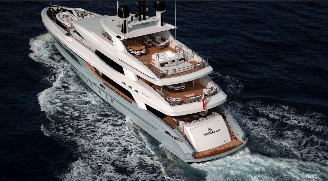 The exterior design of MEDIALLY is the work of the renowned Italian designer Francesco Paszkowski, whose vision has created a vessel that is both striking and elegant. The yacht’s sleek lines and modern aesthetic are complemented by a range of luxurious amenities designed to enhance the onboard experience.