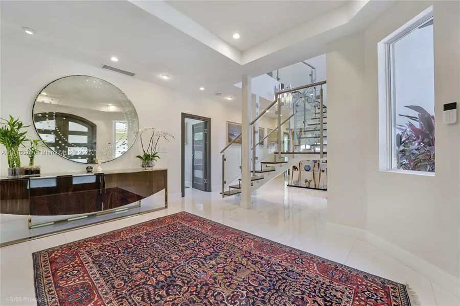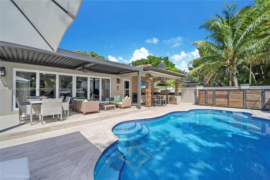 New Construction. Beautiful home near Sunset Elementary Magnet School. Designer impact doors and windows. Pure white glass porcelain flooring throughout. 2 master suites w/ walk-in closets + 2 add’l suites & multipurpose bedroom. The top-of-the-line Italian kitchen is fully equipped with Miele stainless steel appliances. Modular aluminum/glass closets in every bedroom. Italian wooden doors with aluminum detailing. Integrated central vacuum system. Automatic gate with video door entry. CCTV covering the exterior. New heated saltwater pool with waterfall feature. 2018 addition of a barbecue porch equipped with Kalamazoo appliances, a True refrigerator and ice maker, and an outdoor TV. Exterior marble travertine. Additional sun deck porch with Arcadia remote-operated open/close functionality.