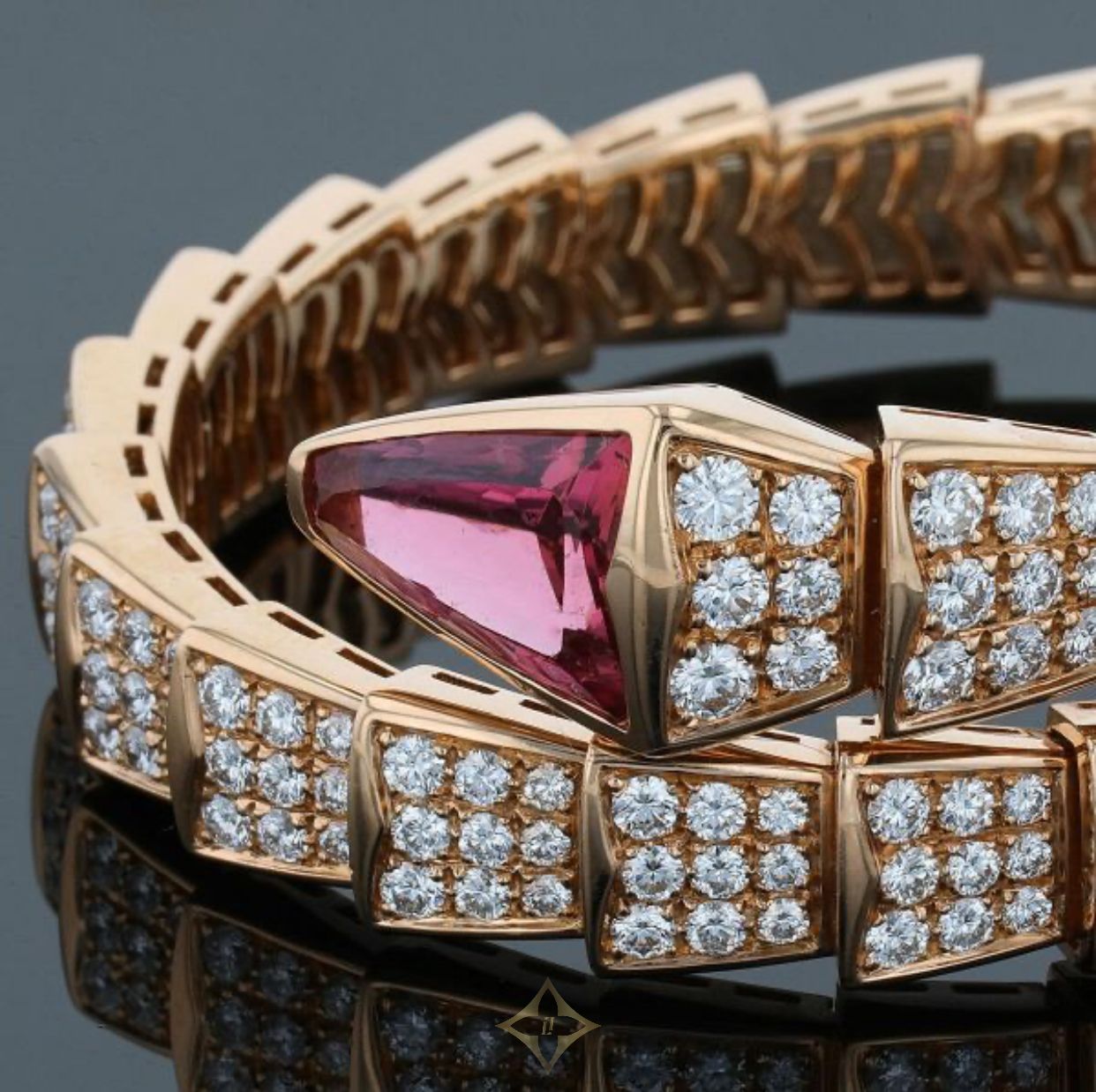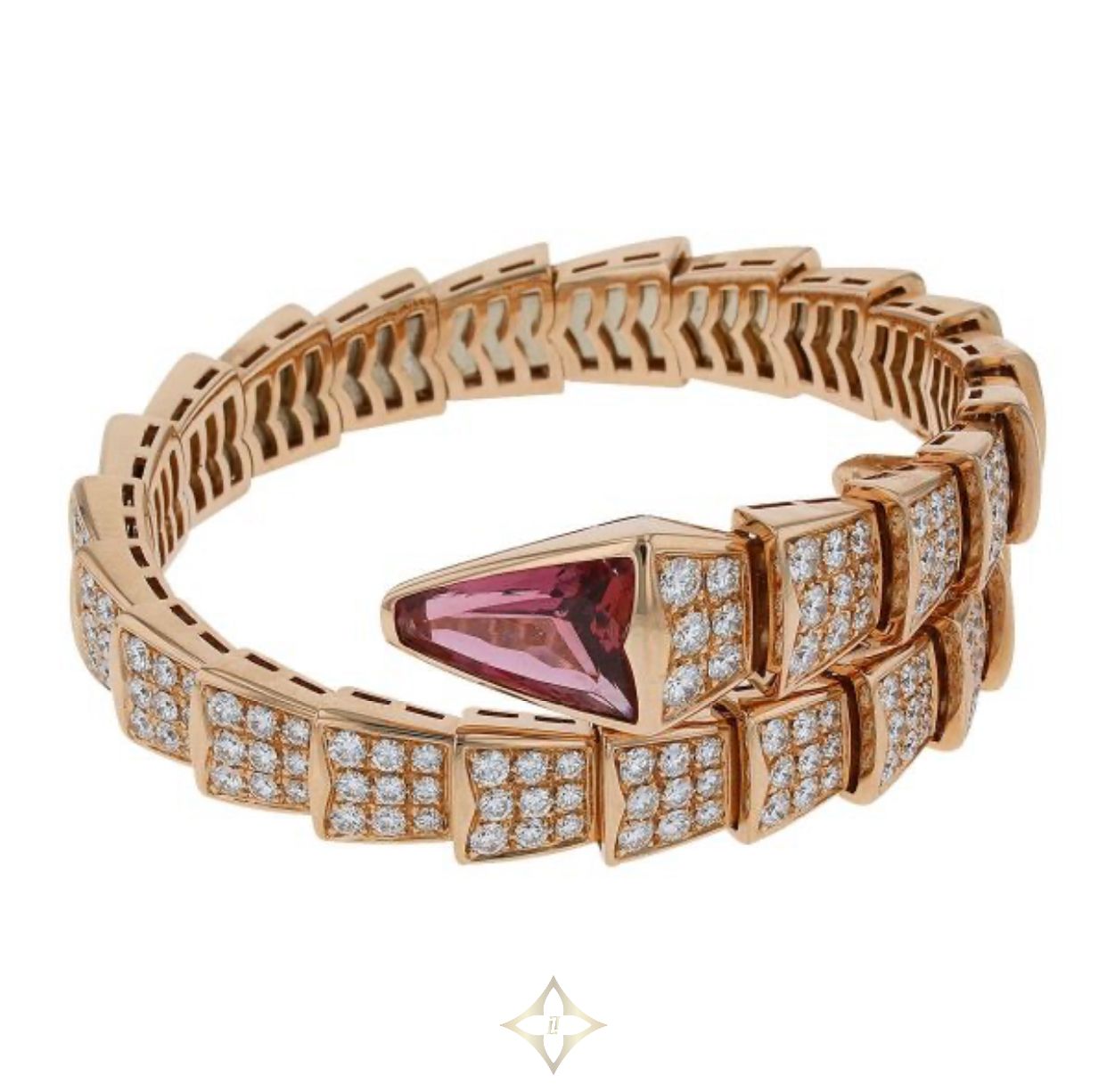 BULGARI Bulgari Serpenti Diamonds, Tourmaline And Gold Bracelet REFERENCE : 22210 PRICE: €65,000 (RETAIL PRICE: 104 000 €) * Brand : Bulgari * Model : Serpenti * Period : Modern * Category : Signed Jewelry * Matierial : 18k rose gold * Gemstone type : Diamond, Tourmaline * Diamonds weight : 7.44 ct * Width : 2.2 cm * Thickness : 0.7 cm * Weight : 63.5 g * Type Pierre. : Diamond | Tourmaline Mikael Dan MIKAEL DAN Paris - Since 1983 20 Rue de Miromesnil, 75008 Paris, France (Director) Mister Mikaël Dan * RCS 351 127 519 * TVA intracom FR 113 511 275 19 Phone: +331 42 65 95 44 WhatsApp: +33 7 61 02 02 04 Email: contact@mikaeldan.com
