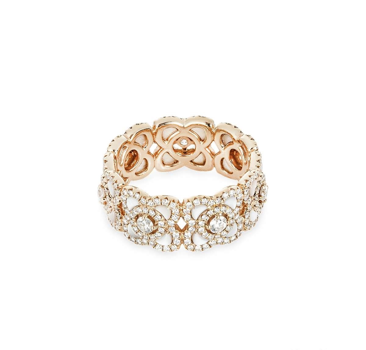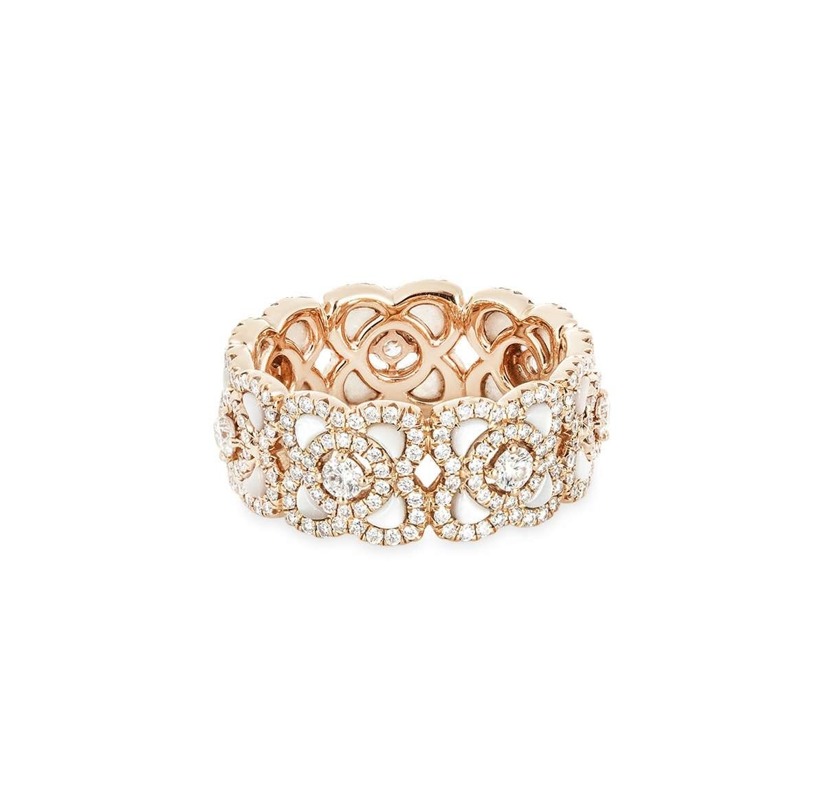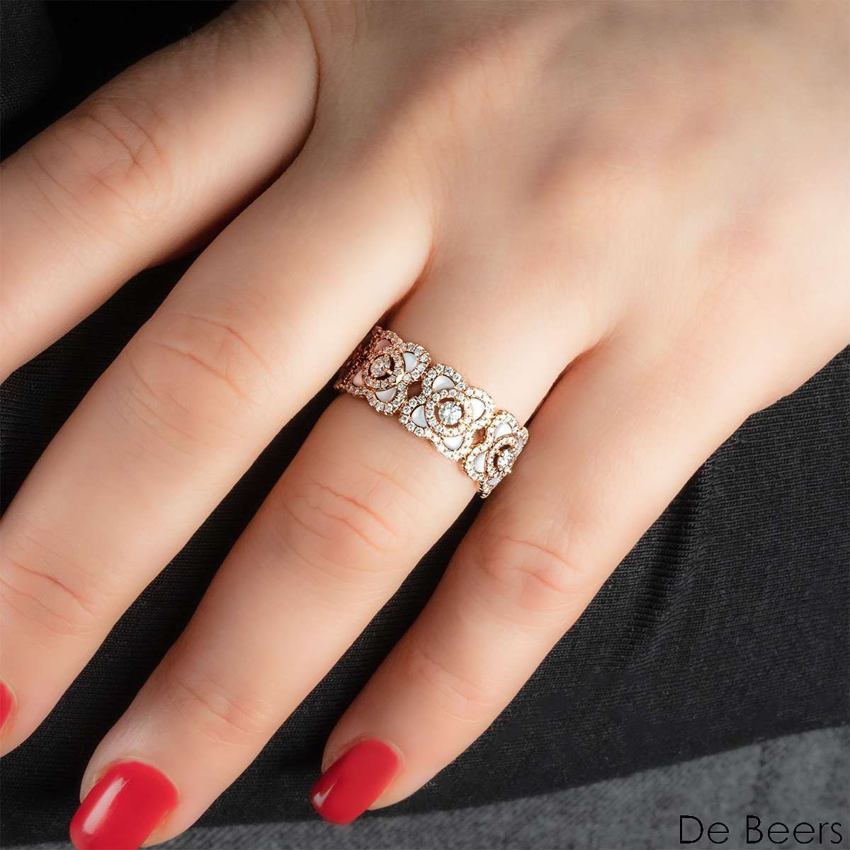De Beers Rose Gold Diamond & Mother Of Pearl Enchanted Lotus Ring Size 55 PRICE: £ 4,950 UK O - EU 55 Available MINT (Pre-owned) Cannot be resized DETAILS An elegant 18k rose gold diamond ring by De Beers from the Enchanted Lotus collection. The band is set with 7 lotus motifs with mother of pearl inlays, pave set throughout with 301 round brilliant cut diamonds with an approximate total weight of 1.26ct, E-G colour and VS clarity. The 8mm wide ring is a size O and has a gross weight of 7 grams. Comes complete with a RichDiamonds presentation box and our own certificate of authenticity. ——— Rich Diamonds VAT Registration No. GB140533939 Company number 07598033 74 New Bond St, London W1S 1RT, United Kingdom