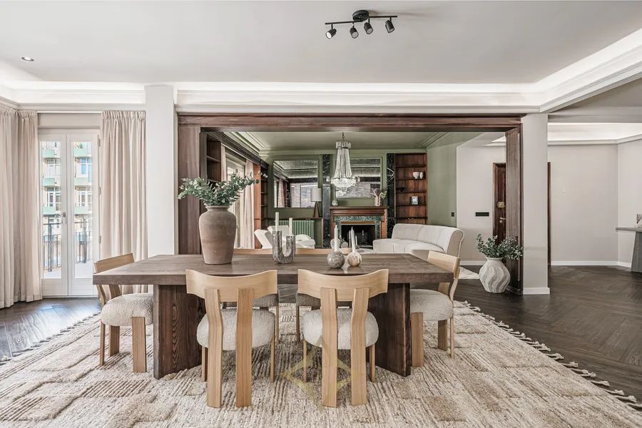 The open-plan layout creates a seamless flow between the grand living and dining areas, where a built-in library and fireplace add character and warmth. A stunning custom-designed Häcker kitchen, finished with Perla Venata Vintage marble and equipped with premium Miele appliances, serves as the heart of the home, combining functionality with impeccable style. Each of the four bedrooms is thoughtfully designed with wooden flooring, custom-made wardrobes, and an atmosphere of understated luxury. Three of the bedrooms feature en-suite bathrooms, while the fourth benefits from a separate guest bathroom, all elegantly finished with ceramic tiles, high-end fixtures, and electric underfloor heating for added comfort.