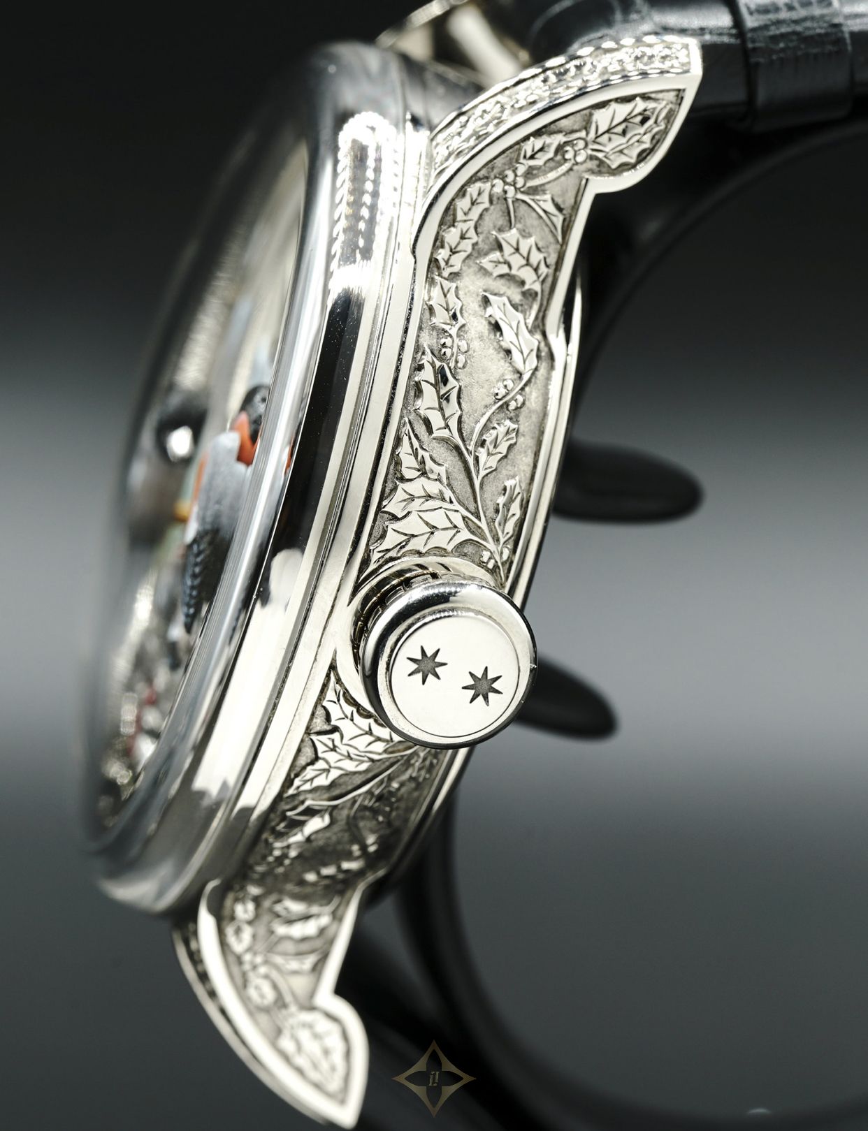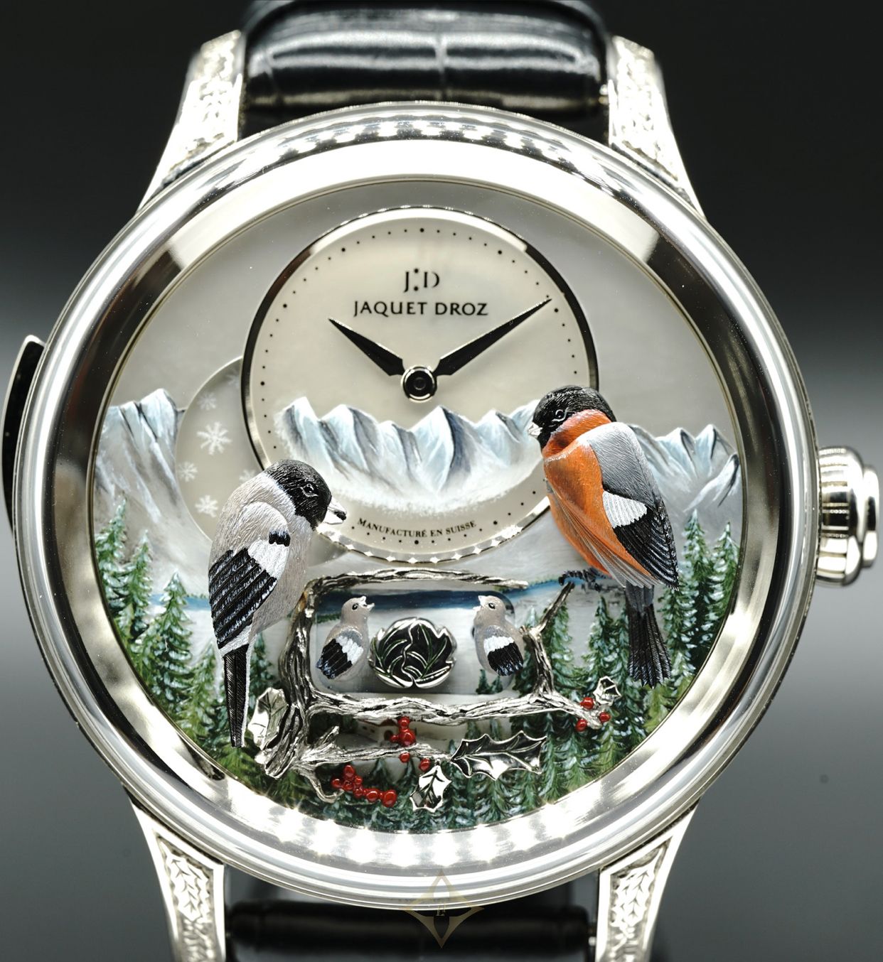 Hand-engraved and hand-painted white mother-of-pearl dial and subdial. Hand-engraved and hand-painted 18-carat white gold automaton birds. 18-carat white gold case. Minute repeater, hand-winding mechanical movement. Power reserve of 48 hours. Diameter 47 mm. Numerus Clausus of 8.