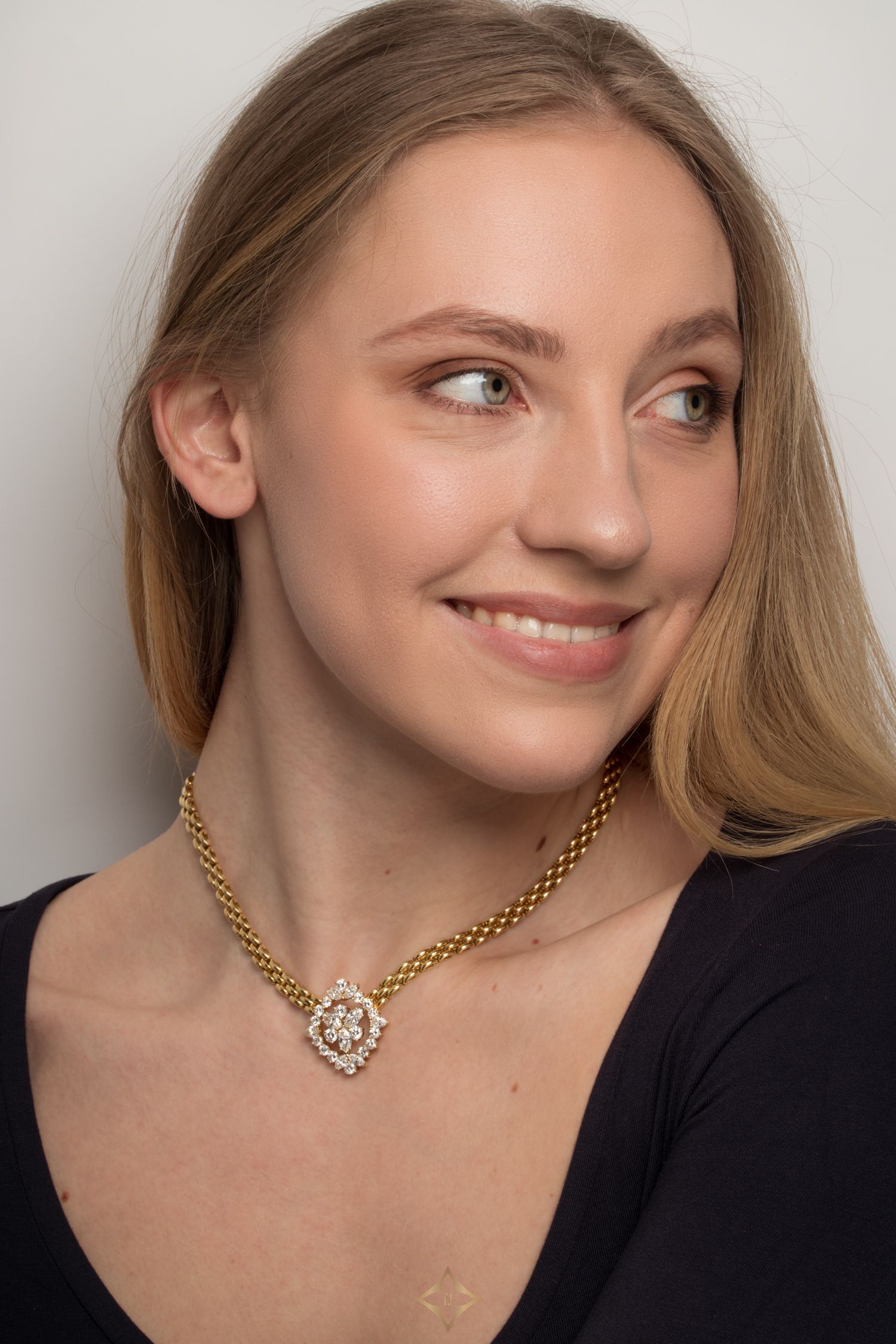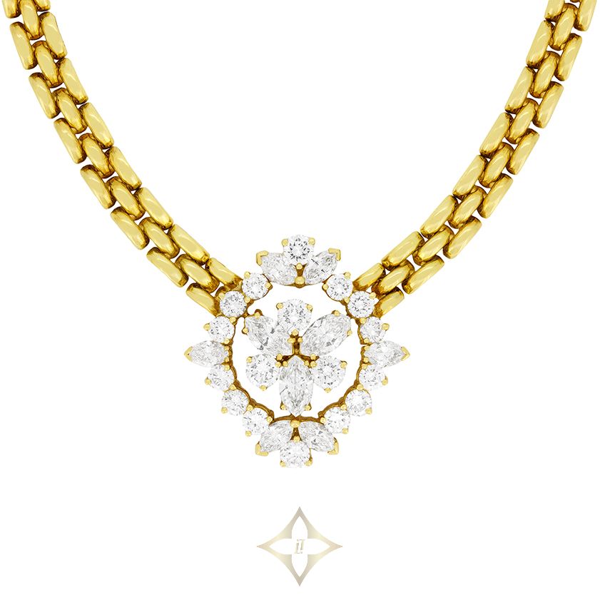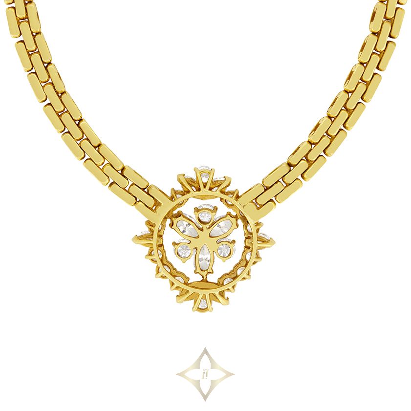 This stunning vintage necklace was crafted by Kutchinsky. It features a total of 5.72 carat diamonds of both marquise and round brilliant cuts. Starting in the centre we have three 0.50 carat marquise diamonds and three 0.30 carat round brilliant diamonds in a alternating circular pattern. encircling these central stones in a dazzling halo are a further twelve round brilliant diamonds totalling 2.12 carat. At each of the cardinal points the array is finished with another marquise stone, with the top and bottom points featuring two of the same cut diamonds. Every diamond in this masterful piece of craftsmanship matches in quality, being graded G in colour and VS in clarity. The pendant back, as well as the thick 16″ chain are crafted from 18 carat yellow gold.