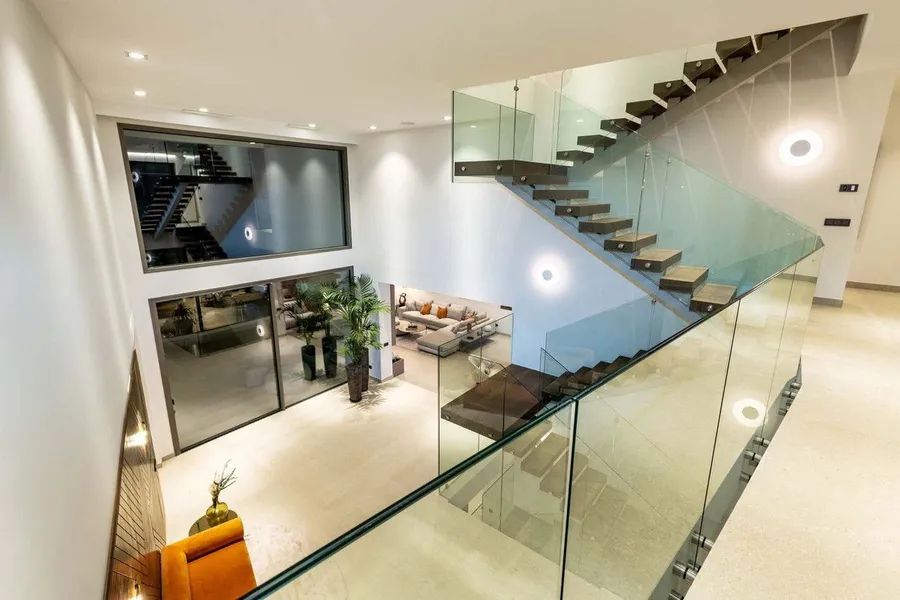 The entrance reveals a spectacular double-height hall with a ”floating” architectural staircase leading to a rooftop terrace designed for sunsets and stars.