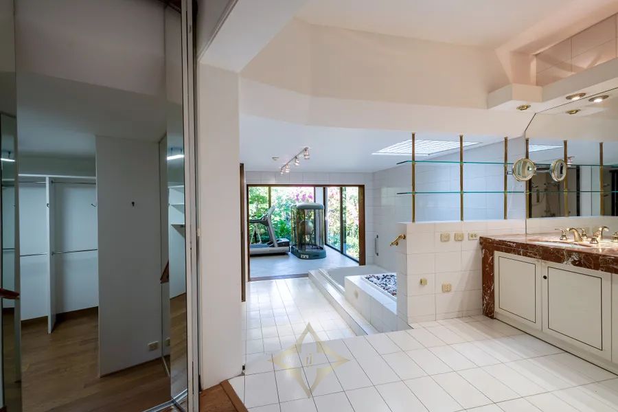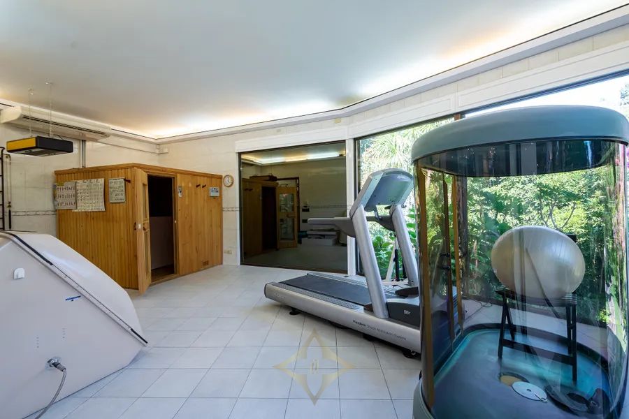 Master bedroom bathroom with jacuzzi, shower, and separate toilet connected to a fully equipped gym with sauna, steam, and spa area, with access to the garden and swimming pools