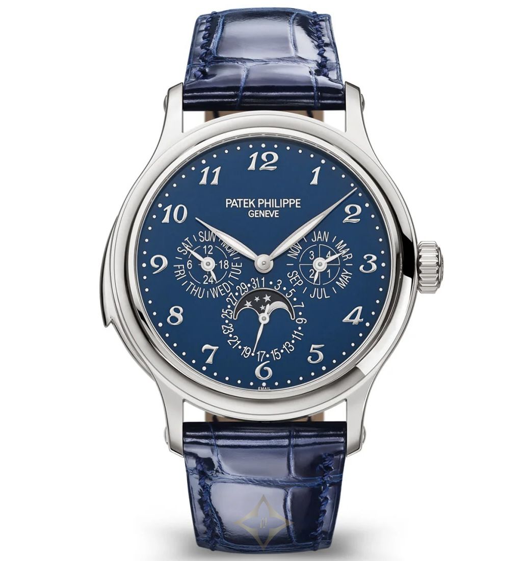Unworn Luxury Patek Philippe Grand Complication watch, 42mm, 18k White Gold, Reference 5374G-001. The case is characterized recessed satin-finished flanks that create a nice contrast with the other polished surfaces and against the cabochons that decorate the ends of the lugs. On the left side, we find the slide for actuating the minute repeater. The grand Feu Enamel dial is high-gloss finished with an intense blue colour that makes the applied large 18k White Gold Breguet numerals stand out clearly. The three subdials display the perpetual calendar indications (day, date, month, and leap year cycle) together with a 24-hour display at 9 o'clock. The moon-phase is displayed at 6 o’clock, well highlighted by in a champlevé́ white gold frame. The leaf-shaped hands in 18k White Gold are filled with a luminous coating for improved legibility even in poor light conditions. Polished 18k White Gold crown that with ribbed edge for comfortable grip and logo Patek Philippe. The dial closed by a Scratch-resistant Sapphire Crystal and Scratch-resistant Sapphire Crystal case back and interchangeable full back. The watch is equipped fixed polished 18k White Gold by a concave bezel. The watch Patek Philippe Caliber R 27 Q has Self-winding mechanical movement, containing 39 Jewels, and power reserve min. 38 hours, max. 48 hours. This model presented on Shiny dusk blue Alligator strap with square scales, hand-stitched, and 18k White Gold fold-over clasp. Case is humidity and dust protected only (not water-resistant).