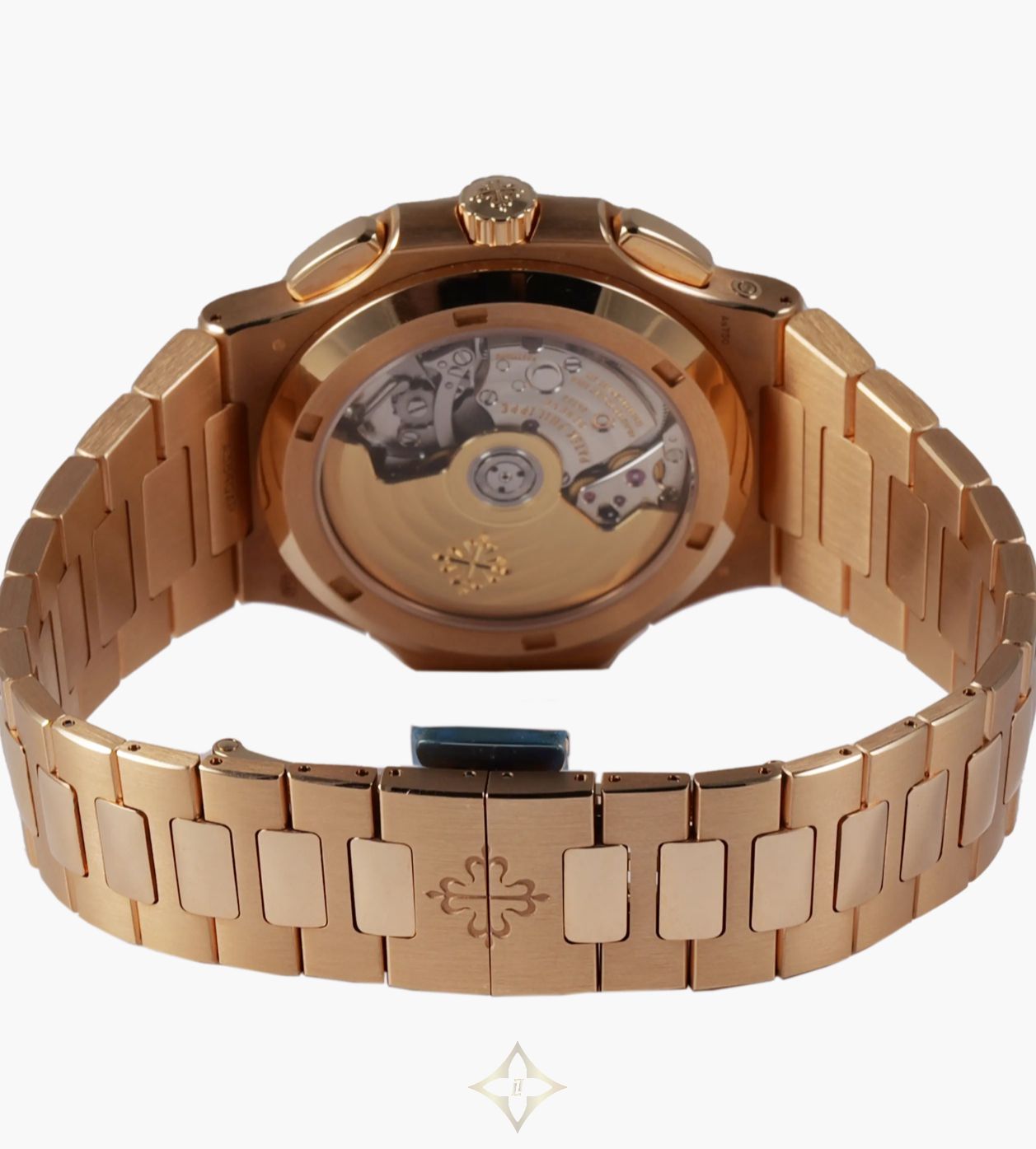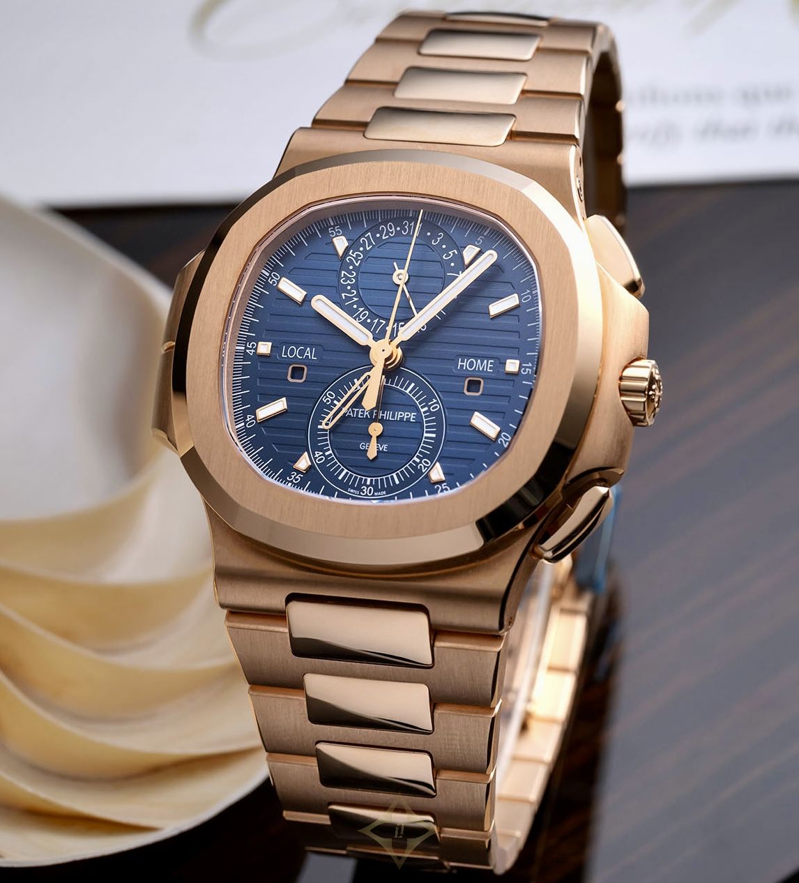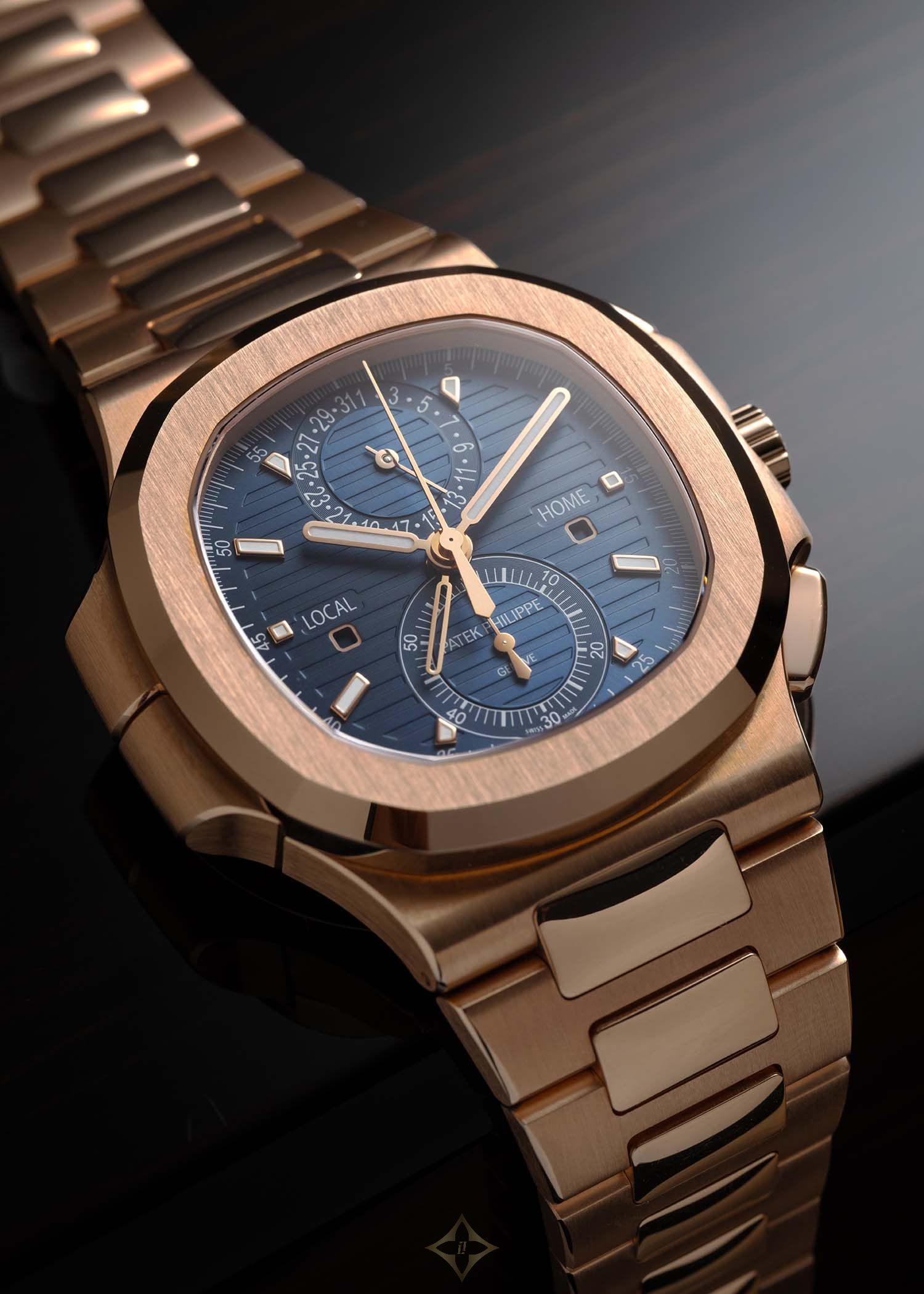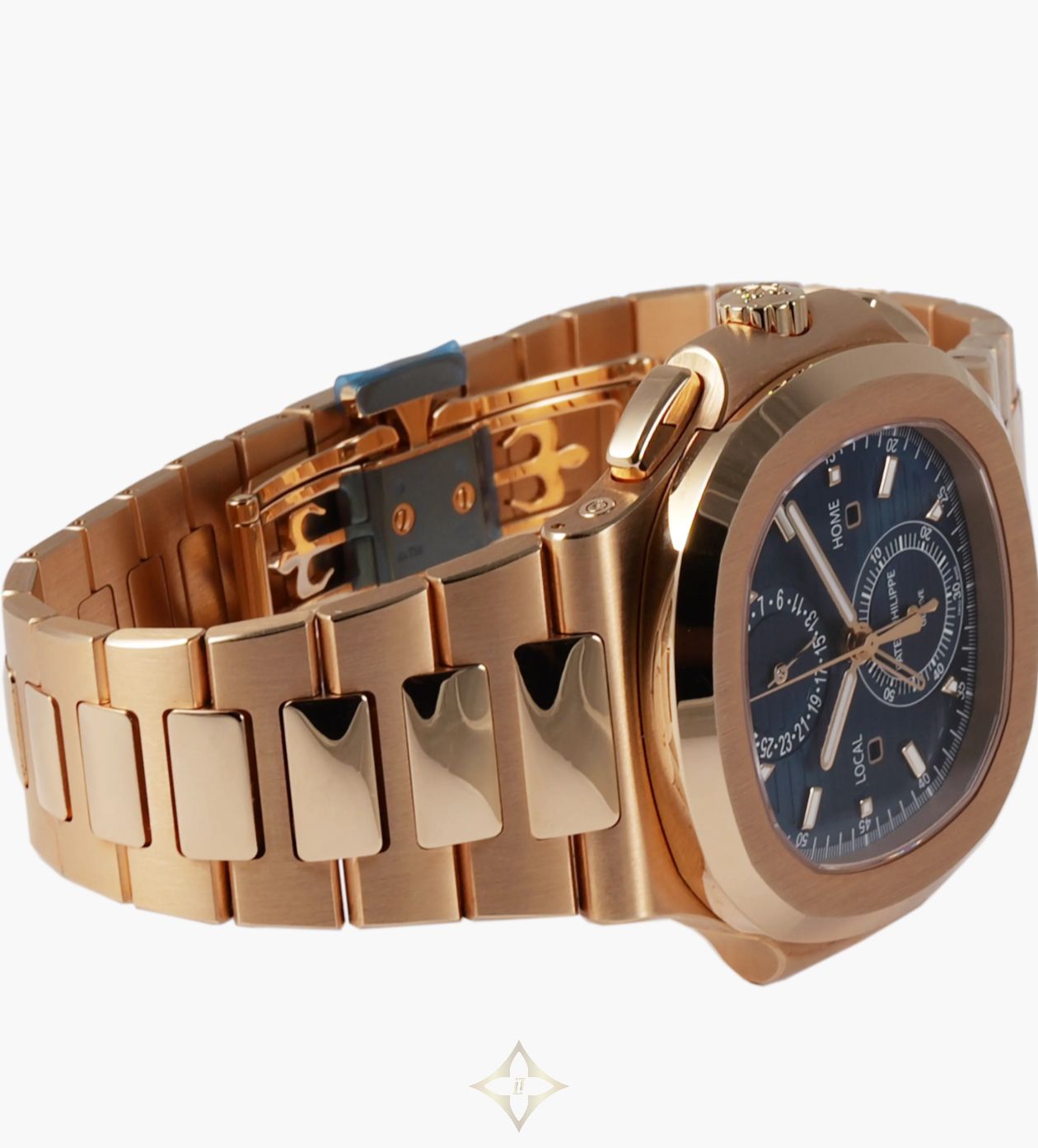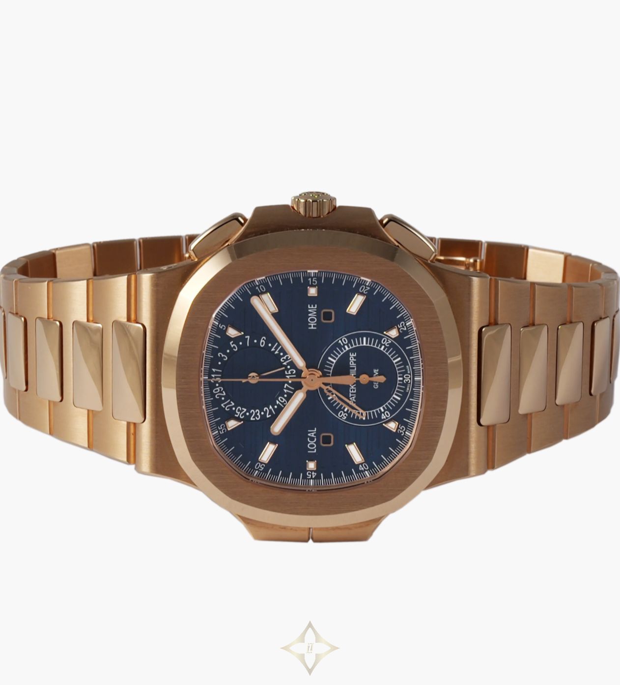 Patek Philippe Nautilus Rose Gold Blue Travel Time Flyback Chronograph 5990/1R-001 PRICE: AUD $450,000 (Incl. GST) Details SKU 233098 Reference 5990/1R-001 Model Nautilus Rose Gold Blue Travel Time Flyback Chronograph Movement PP automatic calibre CH 28-520 C FUS (Patek Philippe Seal) Case 18K rose gold Crystal Sapphire crystal Diameter 40.5mm Thickness 12.53mm Water Resistance 120 metres Bracelet/Strap 18K rose gold Clasp/Buckle 18K rose gold inner folding clasp Year 2021 Manufactured Switzerland Location Sydney, Australia Description This Patek Philippe Nautilus in solid rose gold has Grand Complication level complication packed into a sports watch form factor. It features Gerald Genta's iconic porthole case, 120m water resistance, and an integrated rose gold bracelet with patented fold-over clasp. The sunburst blue dial features an embossed horizontal pattern, luminous baton markers, and a date at 12. It is powered by an automatic movement with flyback chronograph, dual time zones including day/night indicators, and approximately 55-hour power reserve. Accessories The watch comes as a complete set with box and papers. Condition The watch is in brand-new, unworn condition. Shipping We offer free, fully-insured shipping in Australia and worldwide. We ship domestically via overnight courier and internationally via FedEx Priority. Exemptions may apply. ——— Hailwood Peters Watches Suite 2, Level 5, 25 Bligh St, Sydney NSW 2000, Australia (Strictly by appointment only) Phone: +61 472 502 515 WhatsApp: +61 472 502 515 Email: info@hailwoodpeters.com.au