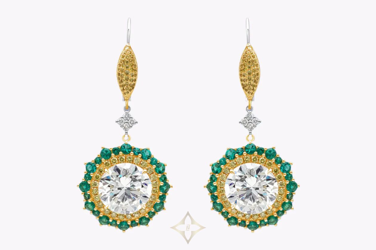 GIA Certified 20.41 Carats Total Round Brilliant Cut Diamond & Emerald Halo Dangle Earrings Price: $499,000.00 DEAR1652 A gorgeous pair of high-end earrings, showcasing two round brilliant cut diamonds weighing 20.41 carats total certified by GIA as M-O color and VSI-VS2 clarity, respectively. Each diamond is surrounded by a halo of 24 round brilliant cut yellow diamonds weighing 2.37 carats total and 24 round shape brilliant emeralds weighing 3.09 carats total. Intricately set on an open-work design of 18K yellow gold basket. Suspended on platinum clips accented by four white diamonds and a cluster of micropavé yellow diamonds, set on a yellow gold half dome. ——— Roman Malakov Diamonds