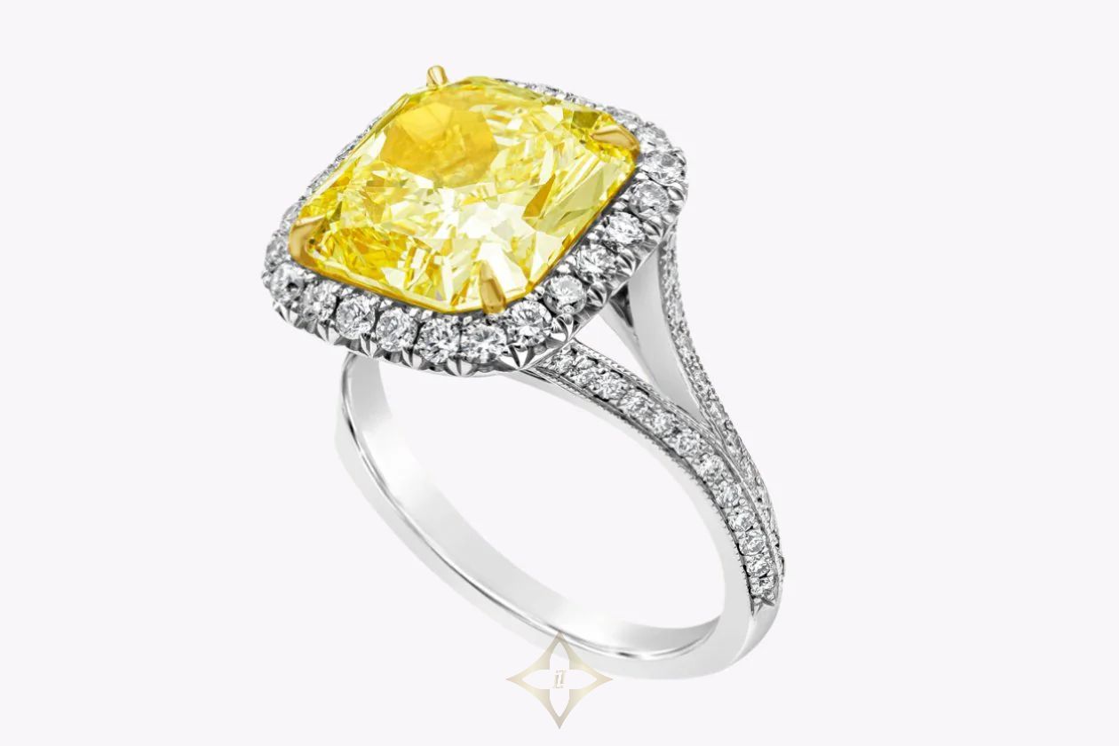 GIA Certified 5.32 Carats Radiant Cut Yellow Diamond Halo Engagement Ring in Yellow & White Gold | New York 🇺🇸