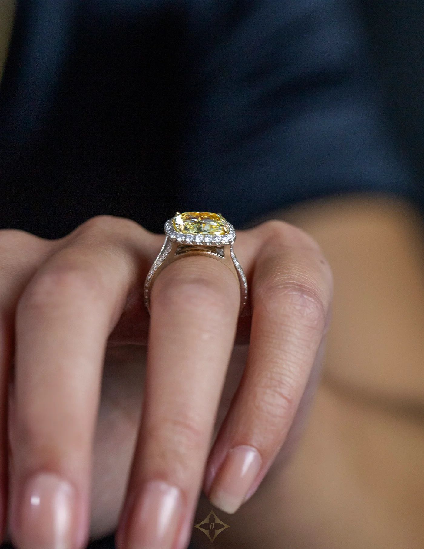 GIA Certified 5.32 Carats Radiant Cut Yellow Diamond Halo Engagement Ring in Yellow & White Gold Price: $139,000.00 RC143/1 A vibrant engagement ring, featuring a 5.32 carats radiant cut diamond certified by GIA as Fancy Yellow color and VS1 clarity, set on a four prong 18K yellow gold basket. Surrounded by a halo of round brilliant cut diamonds weighing 0.85 carat total with G color and VS2 clarity. Accented by a diamond encrusted split-shank in a half-eternity design. Finely made with an 18K white gold mounting. Size 6.5 US, resizable upon request. ——— Roman Malakov Diamonds