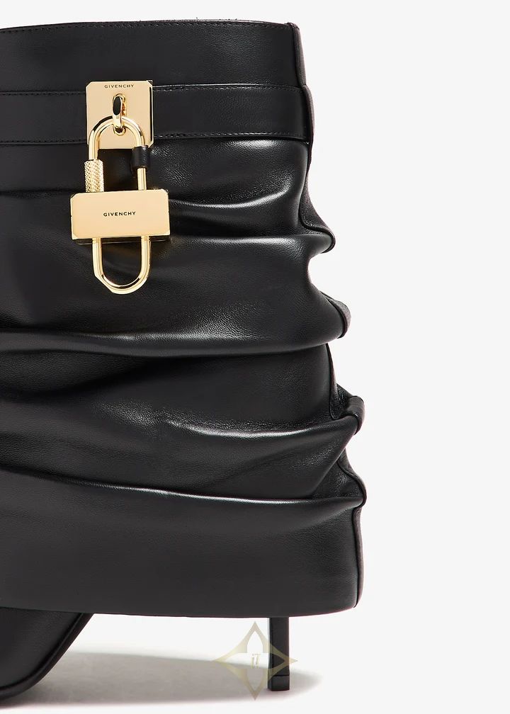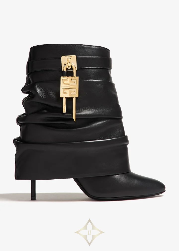 Made from slouchy calfskin leather, the Shark Lock ankle boots by Givenchy are designed with a logo metal clasp around the leg with gold-toned 4G padlocks on the sides. They're finished with an almond-toe silhouette and covered stiletto heels