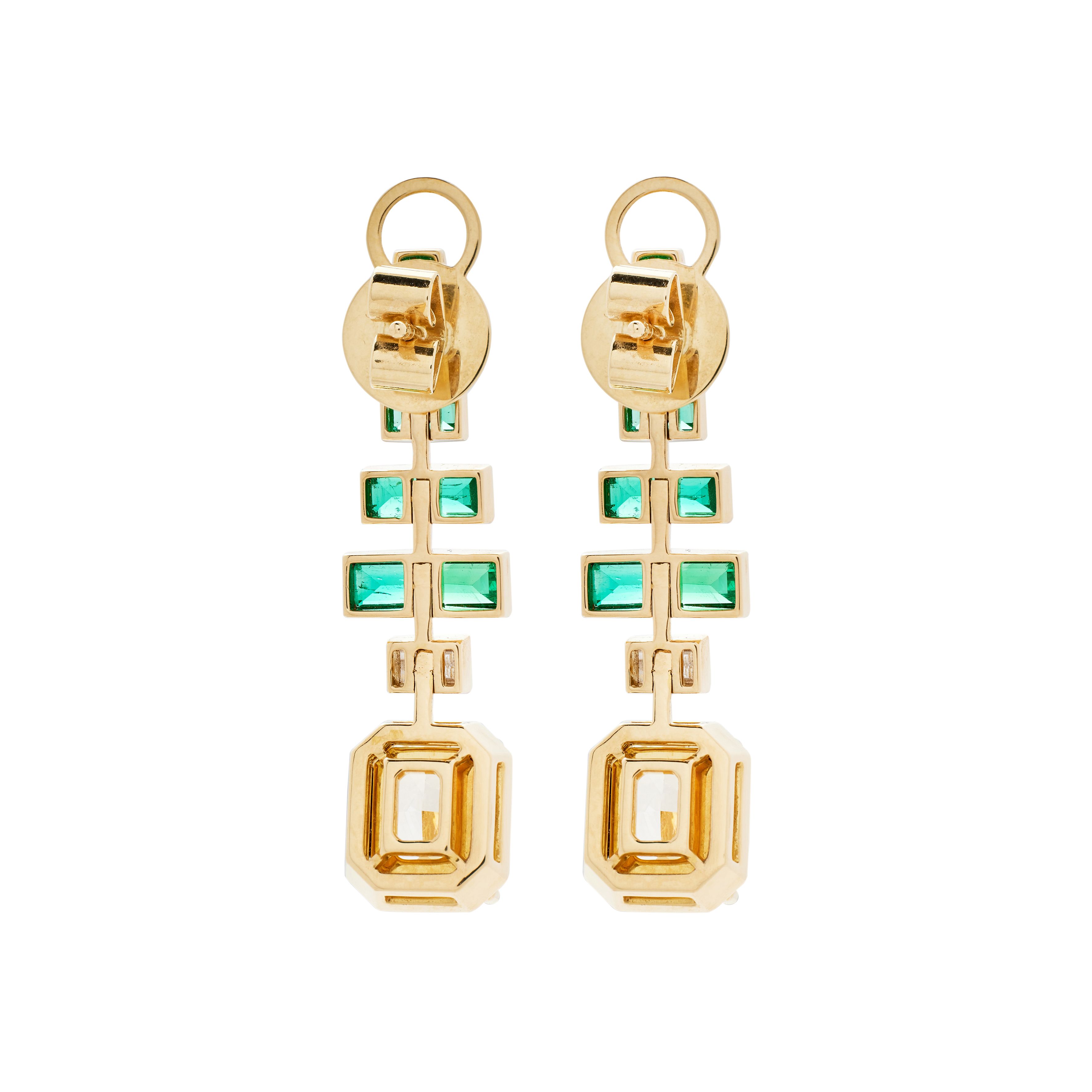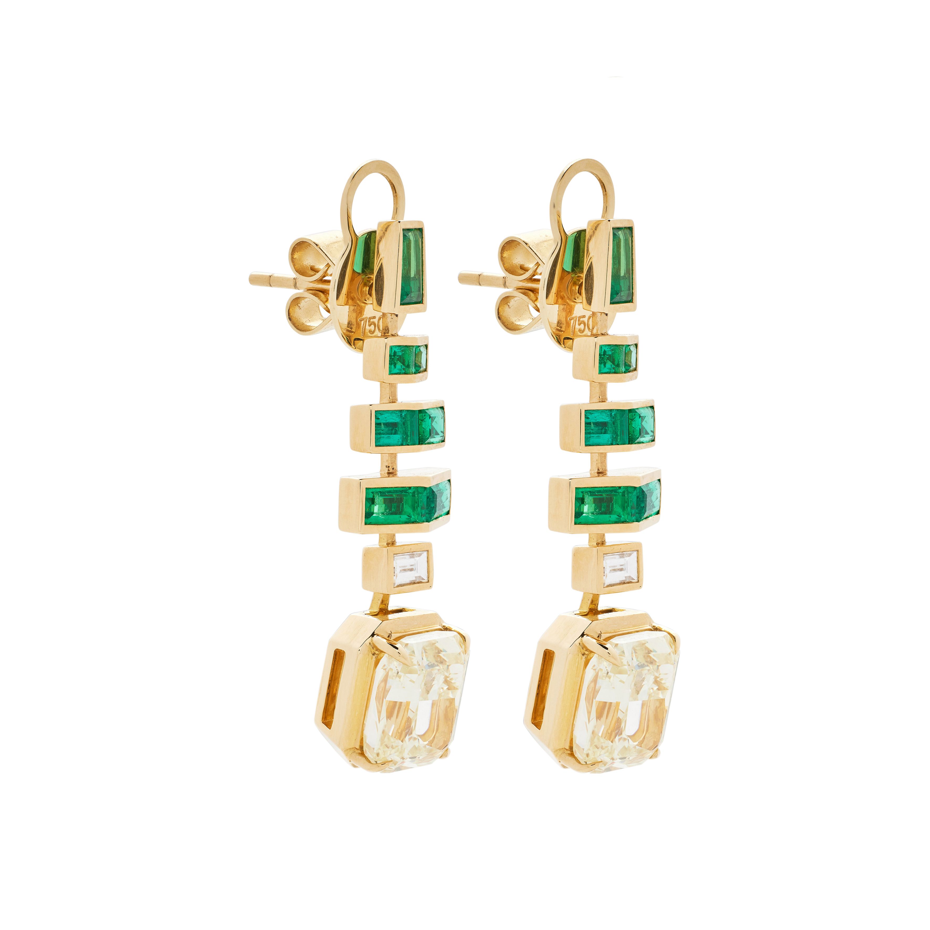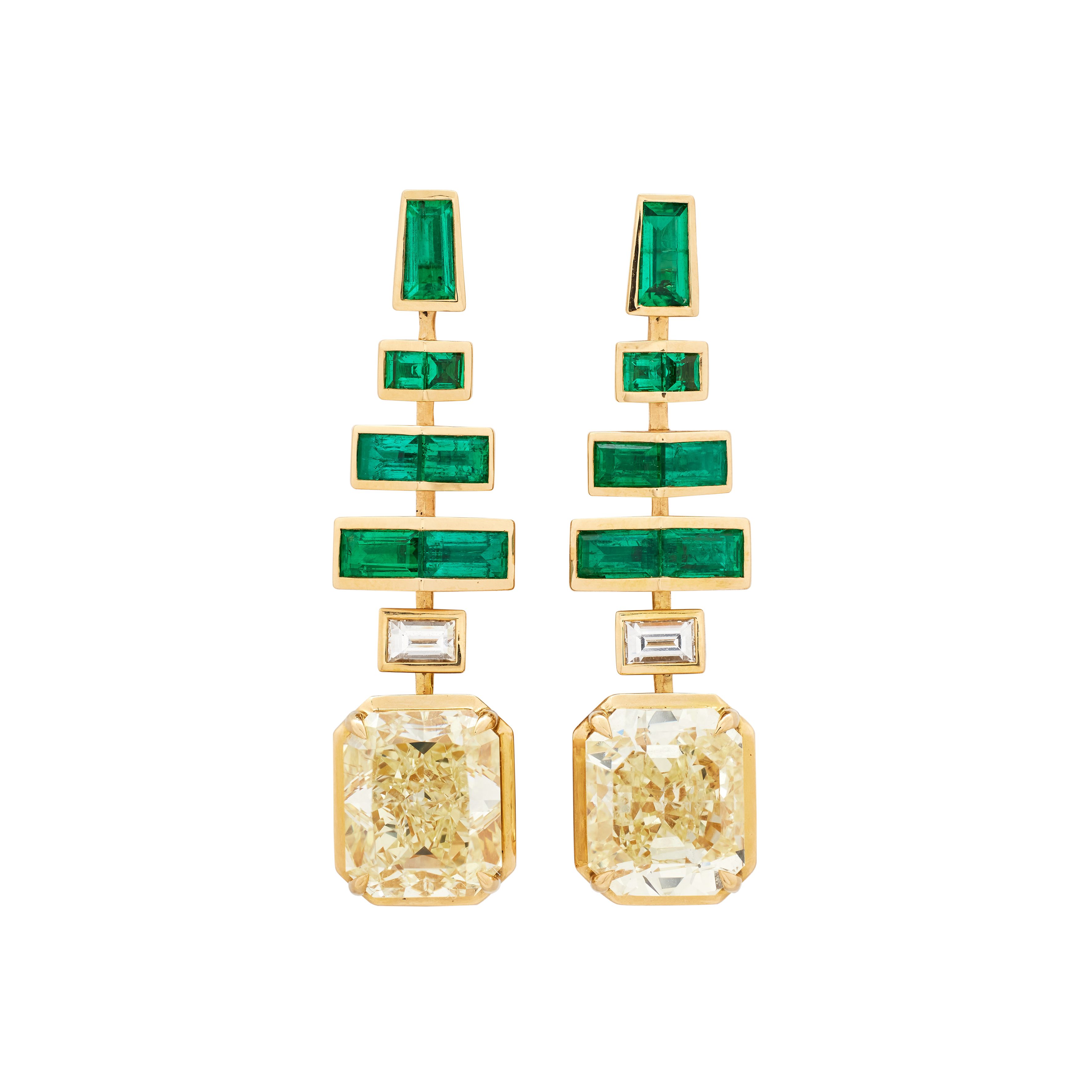 Gold, 6.29ctw Radiant Cut Fancy Light Yellow Diamond, Emerald and Diamond Earrings