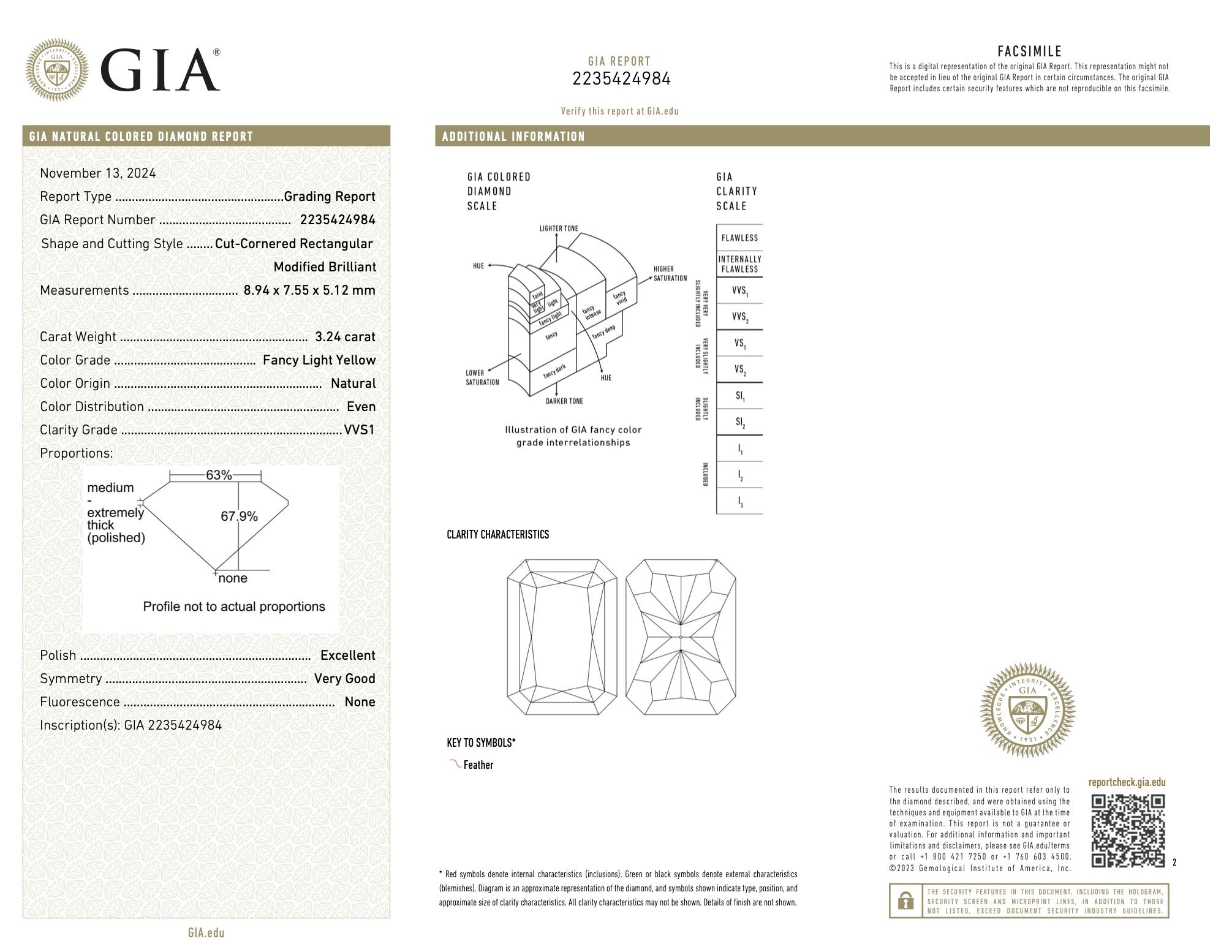 Accompanied by GIA report no. 2235424984, dated 13 November 2024, stating that the 3.24 carat diamond is natural Fancy Light Yellow color and VVS1 clarity with no fluorescence