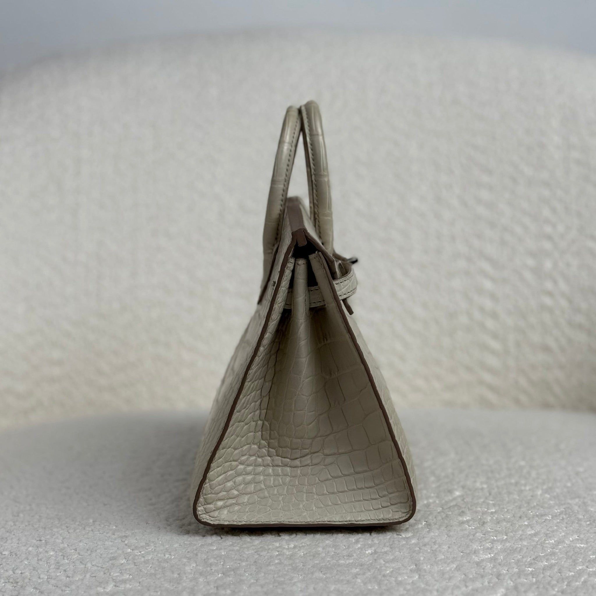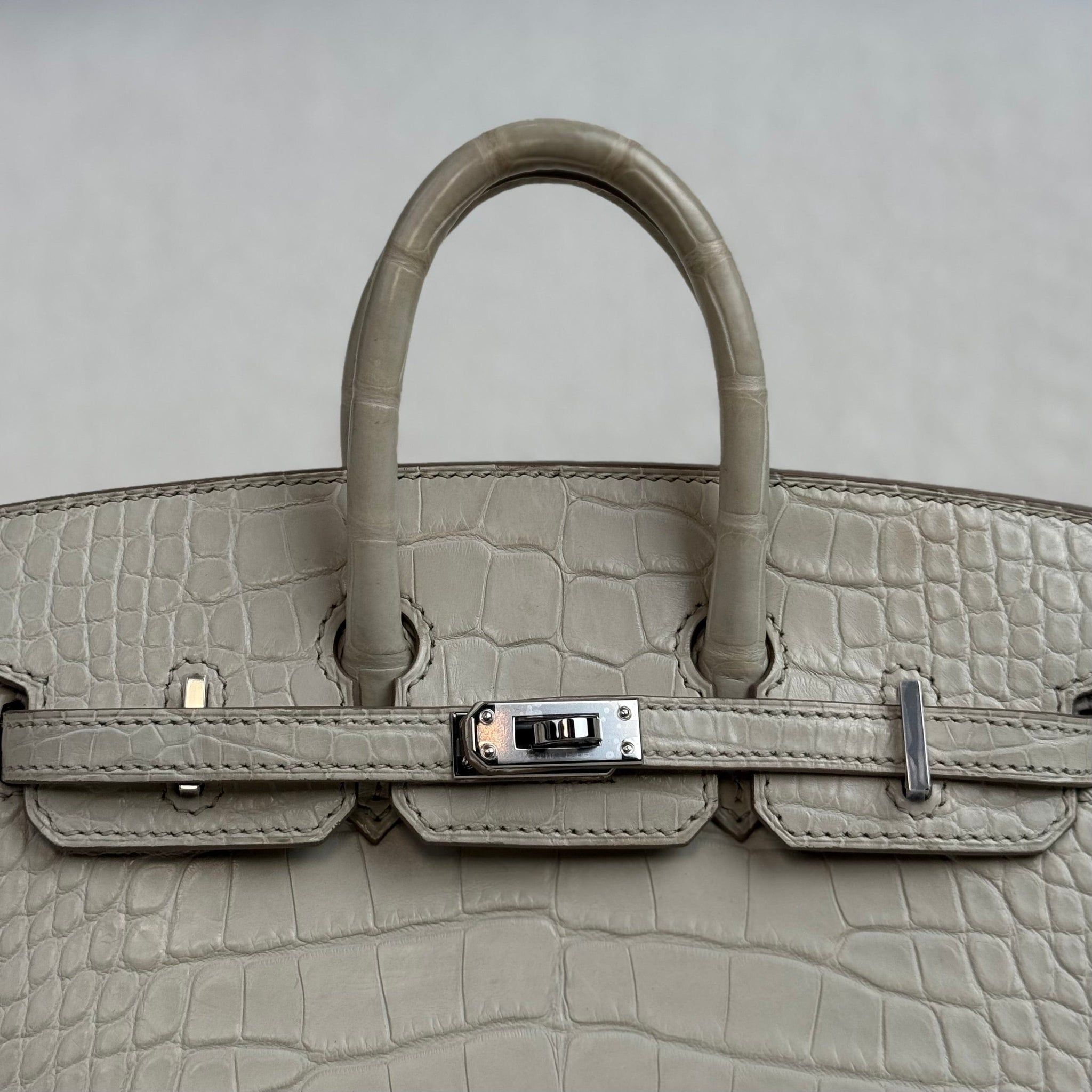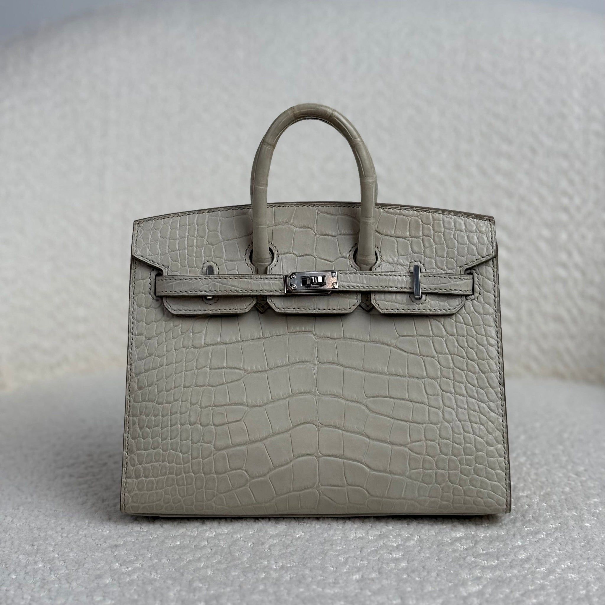 Finished with palladium hardware (PHW), this grey Birkin Sellier 20 achieves a sleek, contemporary balance that complements the cool neutrality of Beton beautifully. The compact 20 size adds to its exclusivity and desirability, making it a standout collector’s piece that transitions seamlessly from elevated daytime styling to refined evening wear. The combination of Beton matte alligator and palladium hardware is particularly prized for its modern, monochromatic appeal.