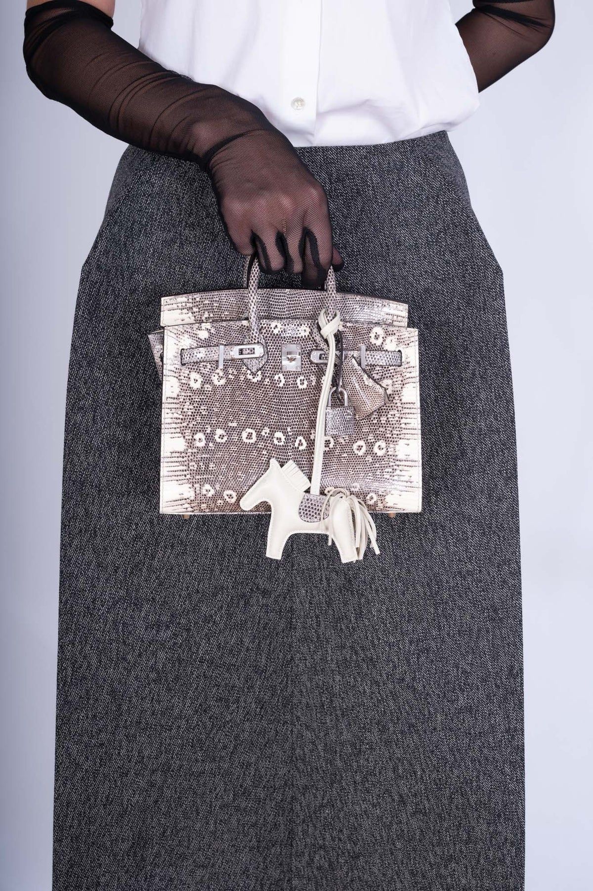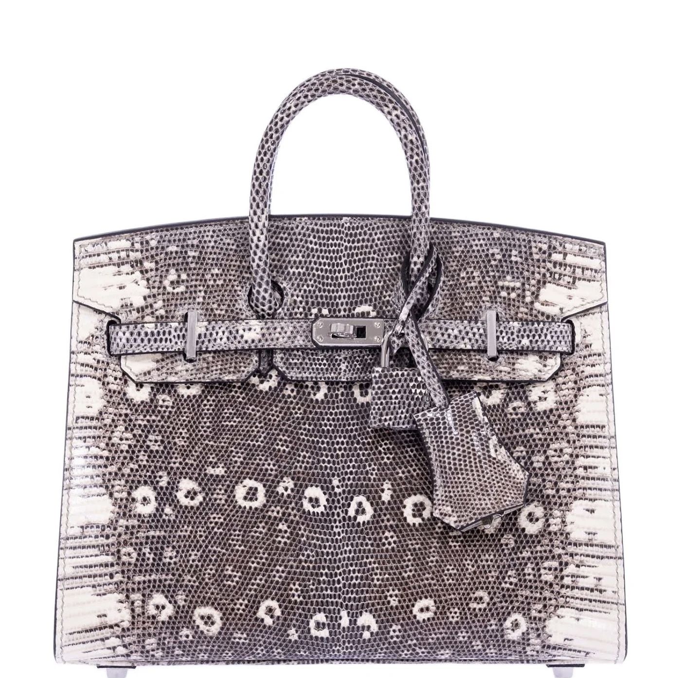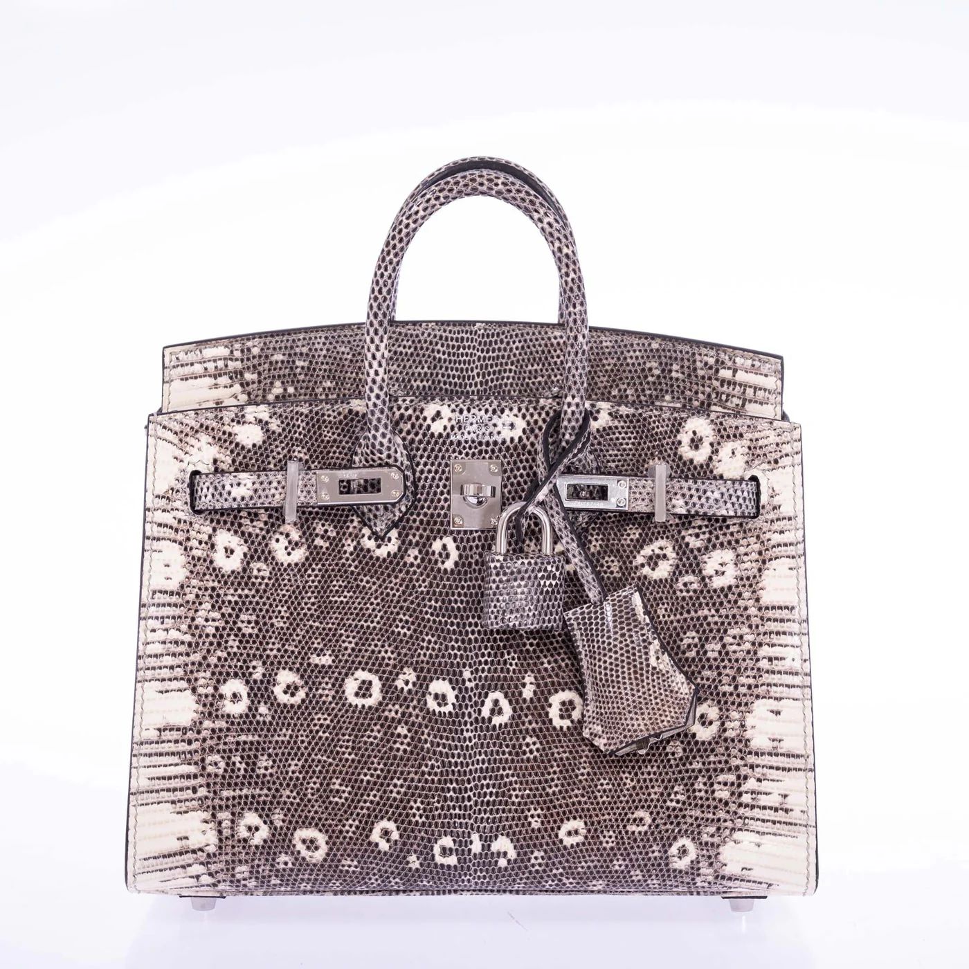 The Hermès Birkin 20 Sellier in Ombré Lizard with Palladium Hardware is one of the rarest Birkin configurations. The Birkin 20 is the smallest Birkin format produced—significantly smaller than the 25cm, designed as an evening bag rather than a functional daily bag. Sellier construction means external stitching and rigid structure, which showcases the lizard scales with sharp edges.