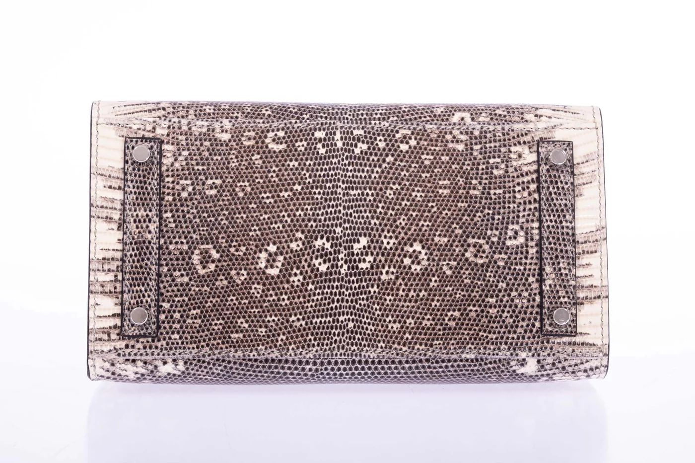 Ombré Lizard refers to Varanus Salvator (water monitor lizard) with natural gradient coloring from light belly scales to darker outer scales. The ombré effect is the lizard's natural pattern, not dyeing—it creates a gradient from pale cream at the center to charcoal grey at the edges. This requires selecting perfectly matched skins with symmetrical patterns. Lizard skin is lighter and more delicate than alligator or crocodile, requiring careful handling. Palladium hardware provides cool-toned harmony with the grey tones. Produced in 2024 with W stamp and in Pristine condition with full set. CITES documentation included for exotic skin.