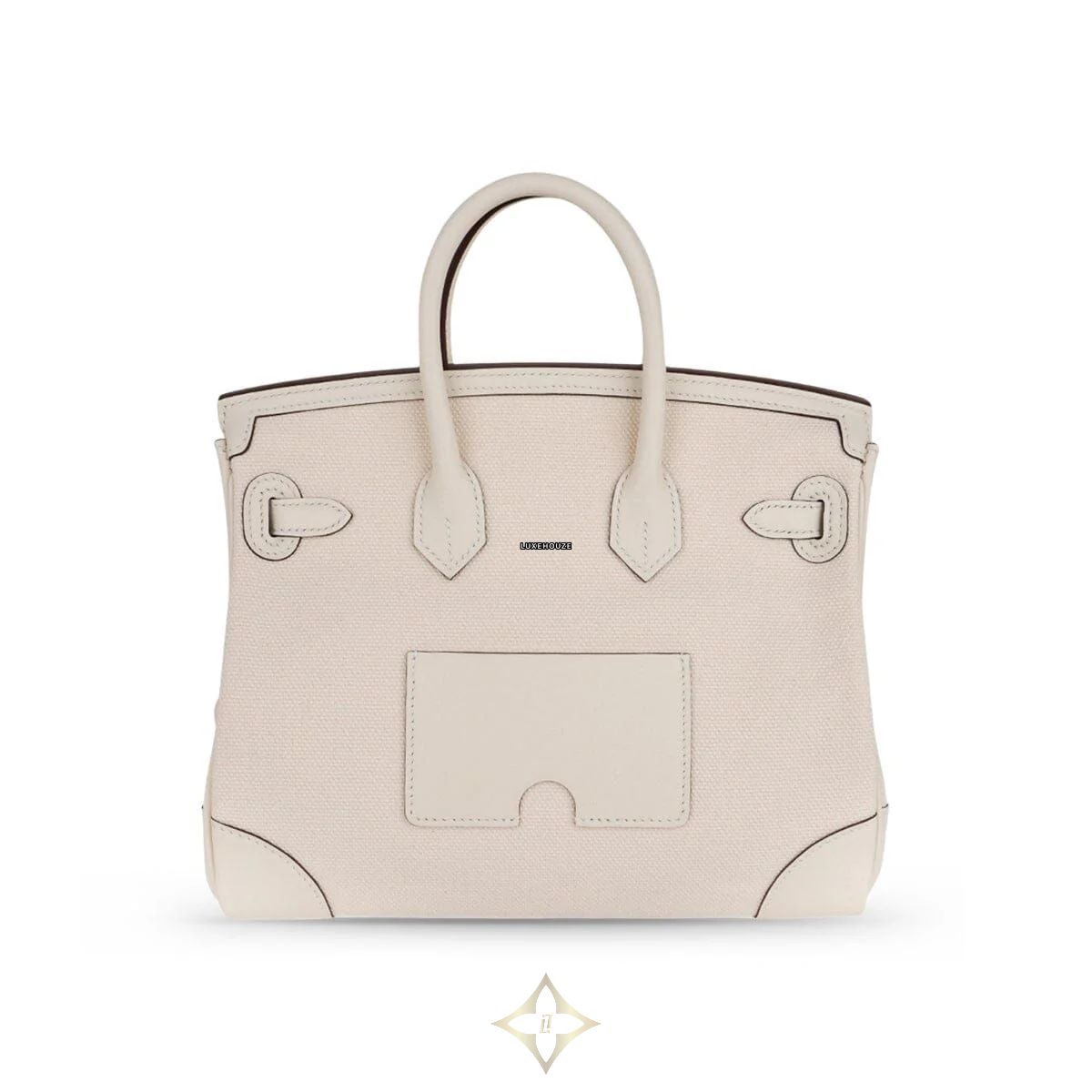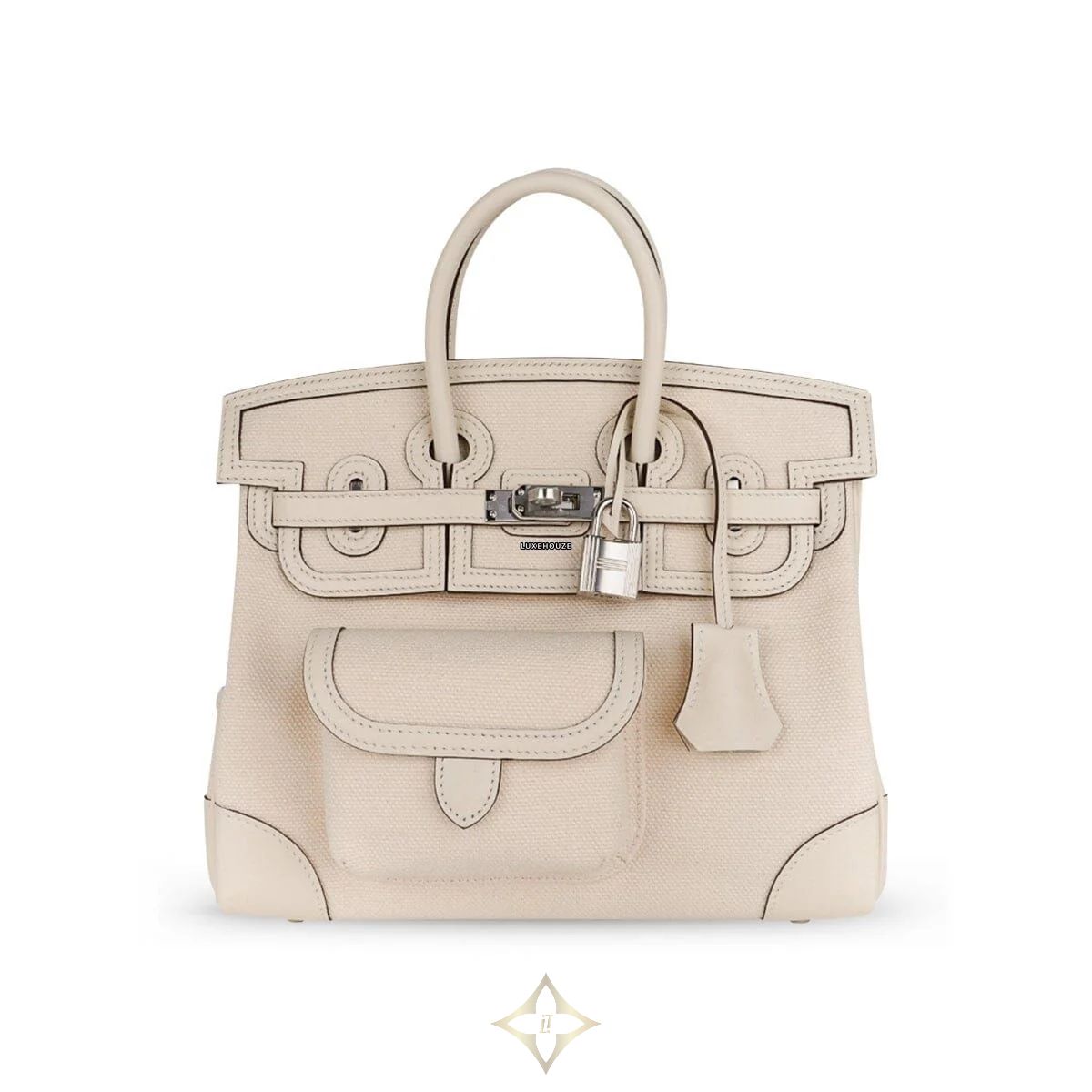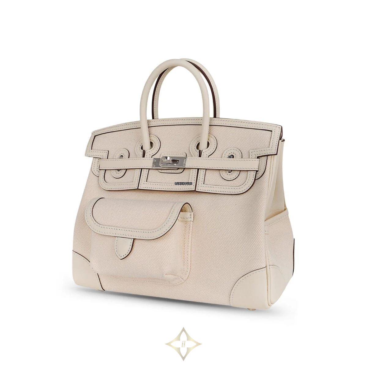 This Hermes Birkin 25 Cargo Nata PHW U is crafted from Goeland canvas and swift leather trim in Nata color, a broken-white tone, that is very soft to the touch, lightweight, and highly resistant to scratches.