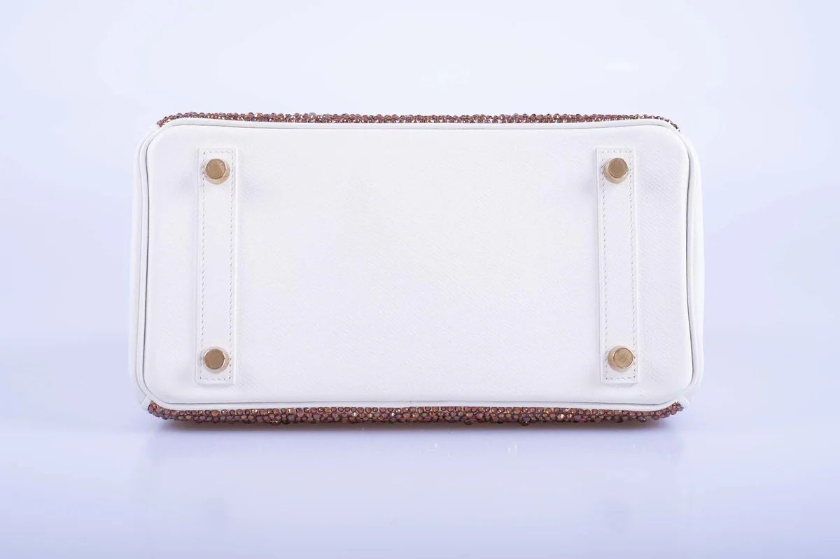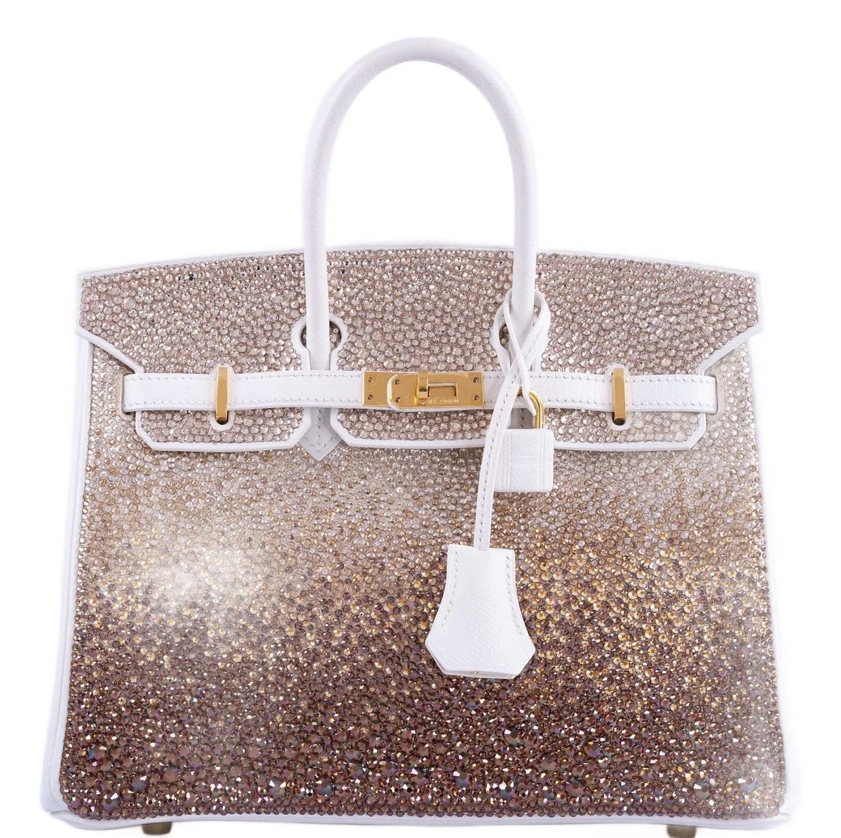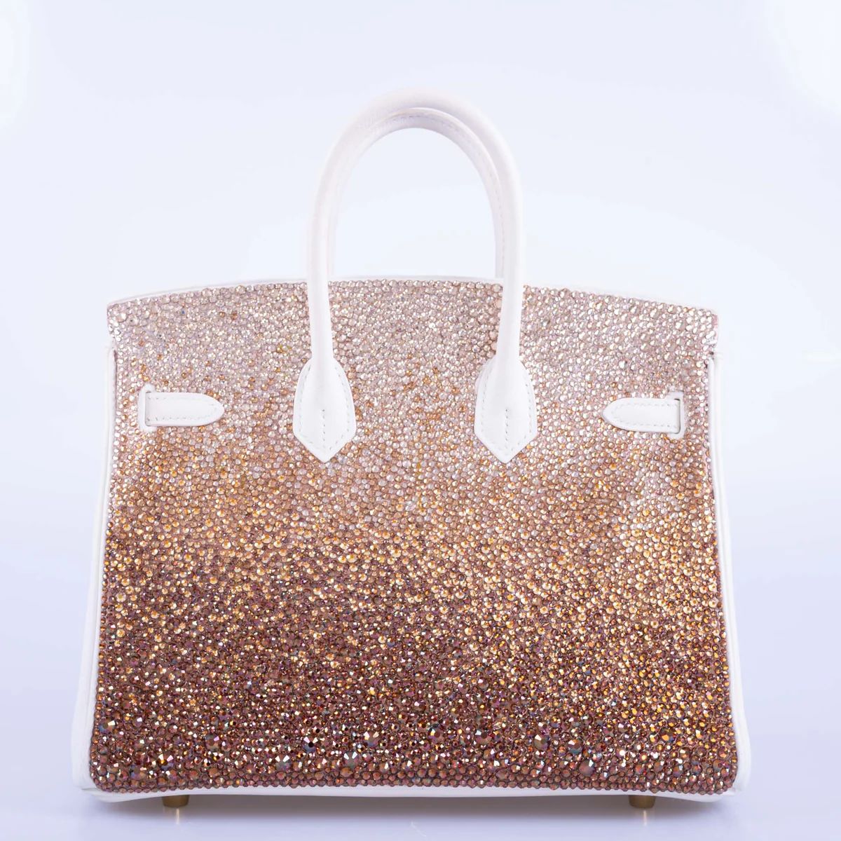"The Ombré" is an extraordinary custom reimagining of the classic Hermès Birkin 25, transforming the icon into a piece of dazzling evening wear. This masterpiece features front and back panels lavishly adorned with thousands of meticulously hand-applied Swarovski Crystals. The crystals are arranged in a mesmerizing gradient, shifting seamlessly from deep bronze and gold tones at the base to sparkling champagne and clear crystal at the top.