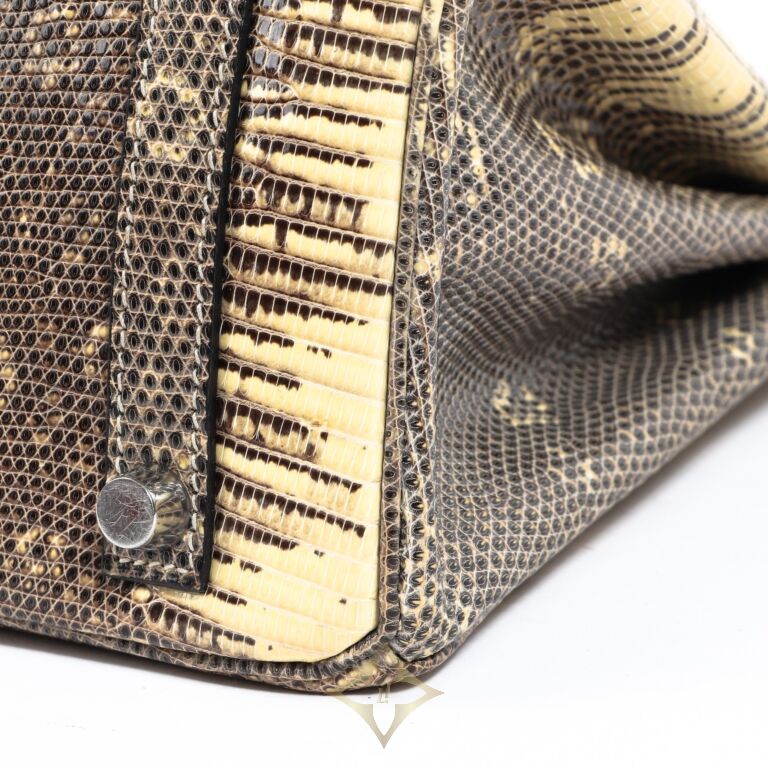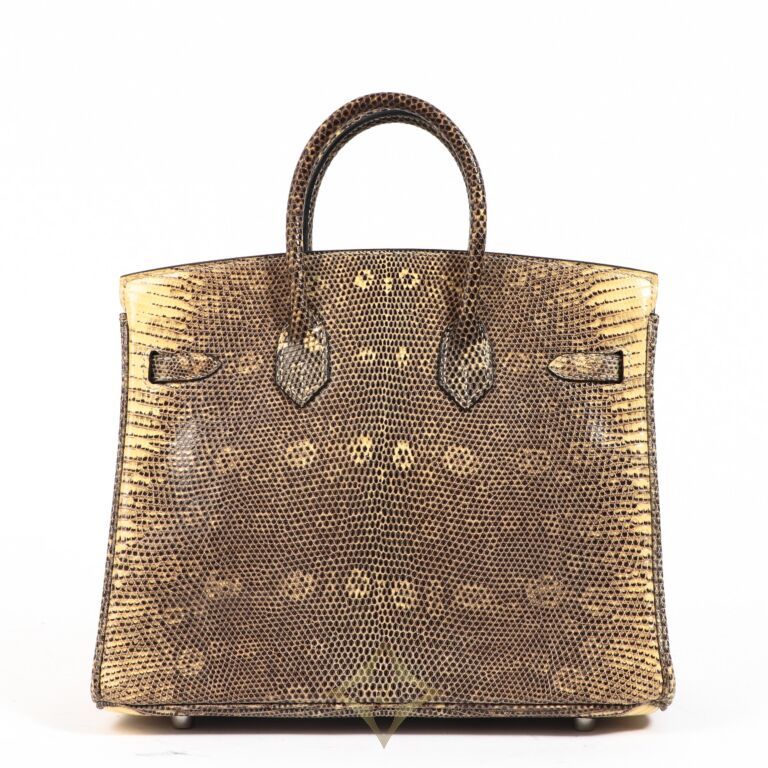 Extremely hard to find, this fantastic Hermès Birkin 25 in lizard may have the most spectacular and stunning ombre effect: a symmetrical pattern that emphasizes the fineness of the Varanus Salvator lizard scales.