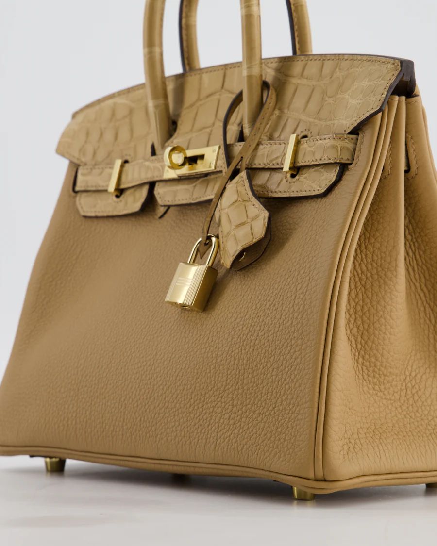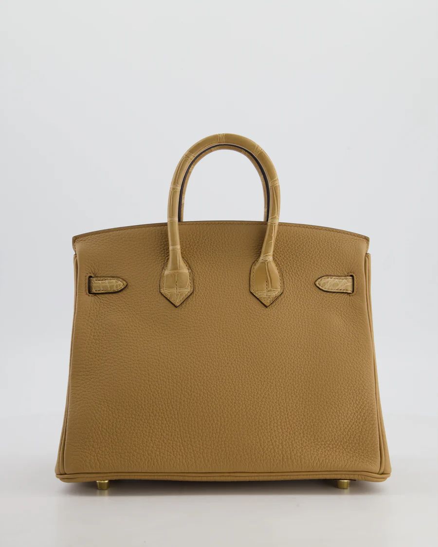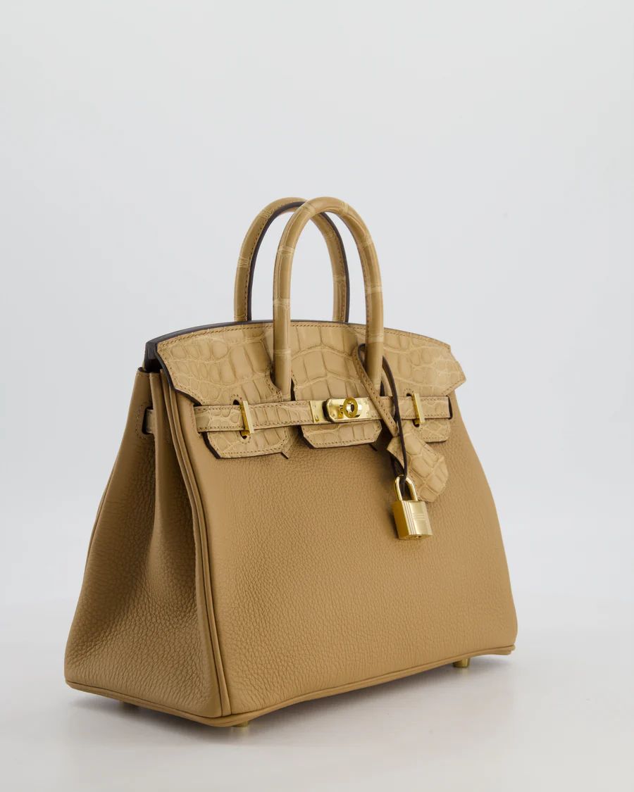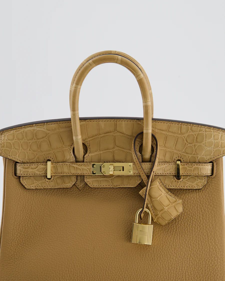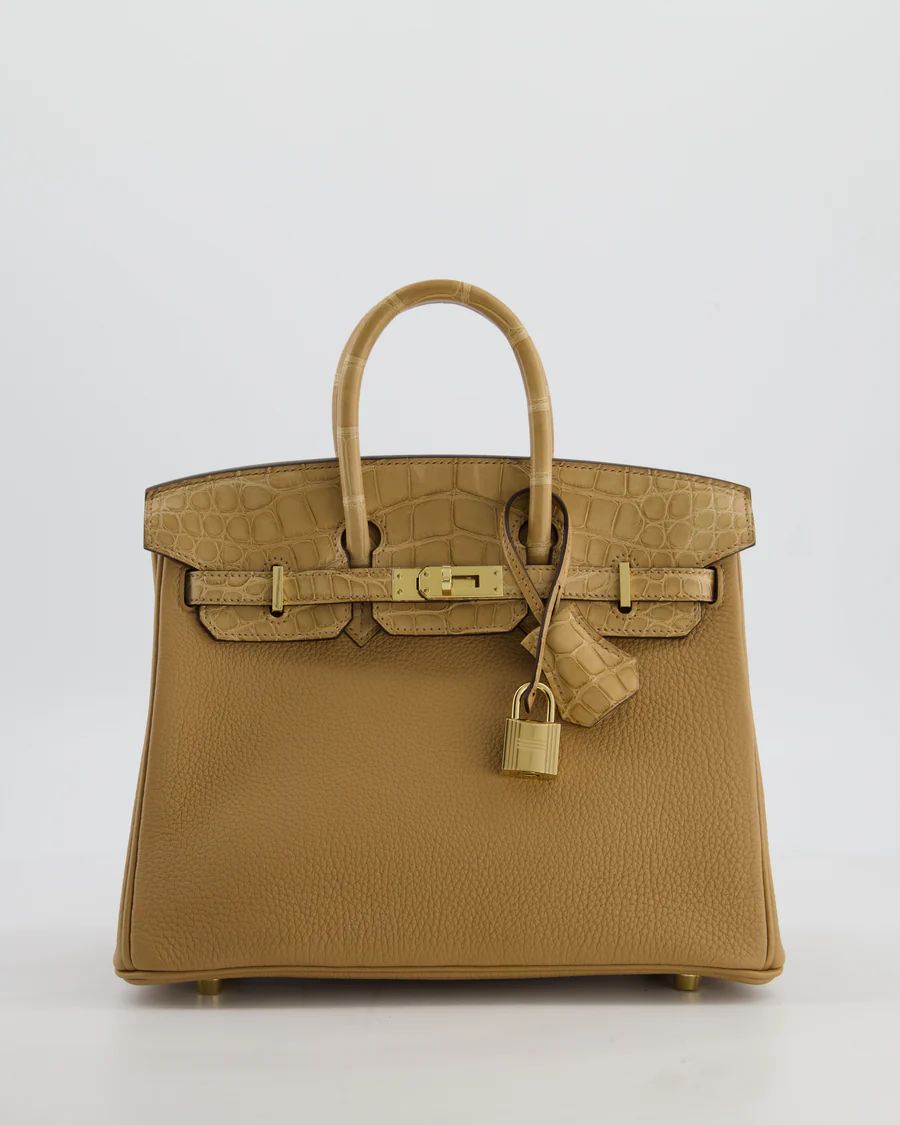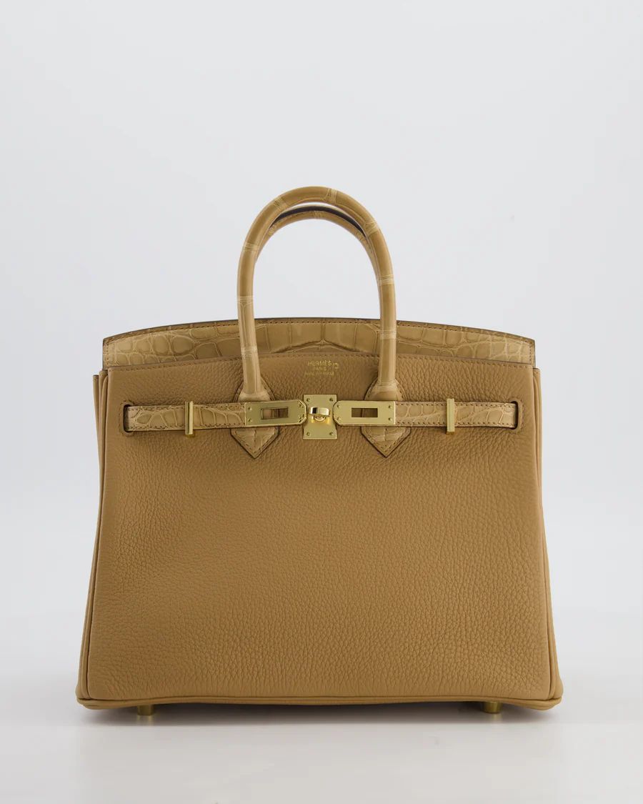 HERMES *SUPER HOT & RARE* HERMÈS BIRKIN 25 RETOURNE TOUCH BAG IN CHAI TOGO AND CHAI ALLIGATOR MISSISSIPPIENSIS LEATHER WITH GOLD HARDWARE PRICE: £29,950 Hermès Birkin 25 Retourne Touch Bag in Chai Togo and Chai Matte Alligator Mississippiensis Leather with Gold Hardware This bag is in pristine condition Please note that the seals are not present on the turning lock and the pontets Please see all of the photos for more information on this item Brand - Hermès Model - Birkin 25 Retourne Touch Materials - Togo and Alligator Mississippiensis Leather Colour - Chai Hardware - Gold Accompanied by the original box, original dustbag, lock, key, clochette, felt cover, rain cover, original redacted receipt, and CITES Measurements – 20cm x 12cm x 6cm Stamp - U Year - 2022 Ref - 047900 ——— SELLIER KNIGHTSBRIDGE 6 Cheval Place, London, SW7 1ES, United Kingdom Tel:  +44 20 7581 2380 Email: shop@sellierknightsbridge.com