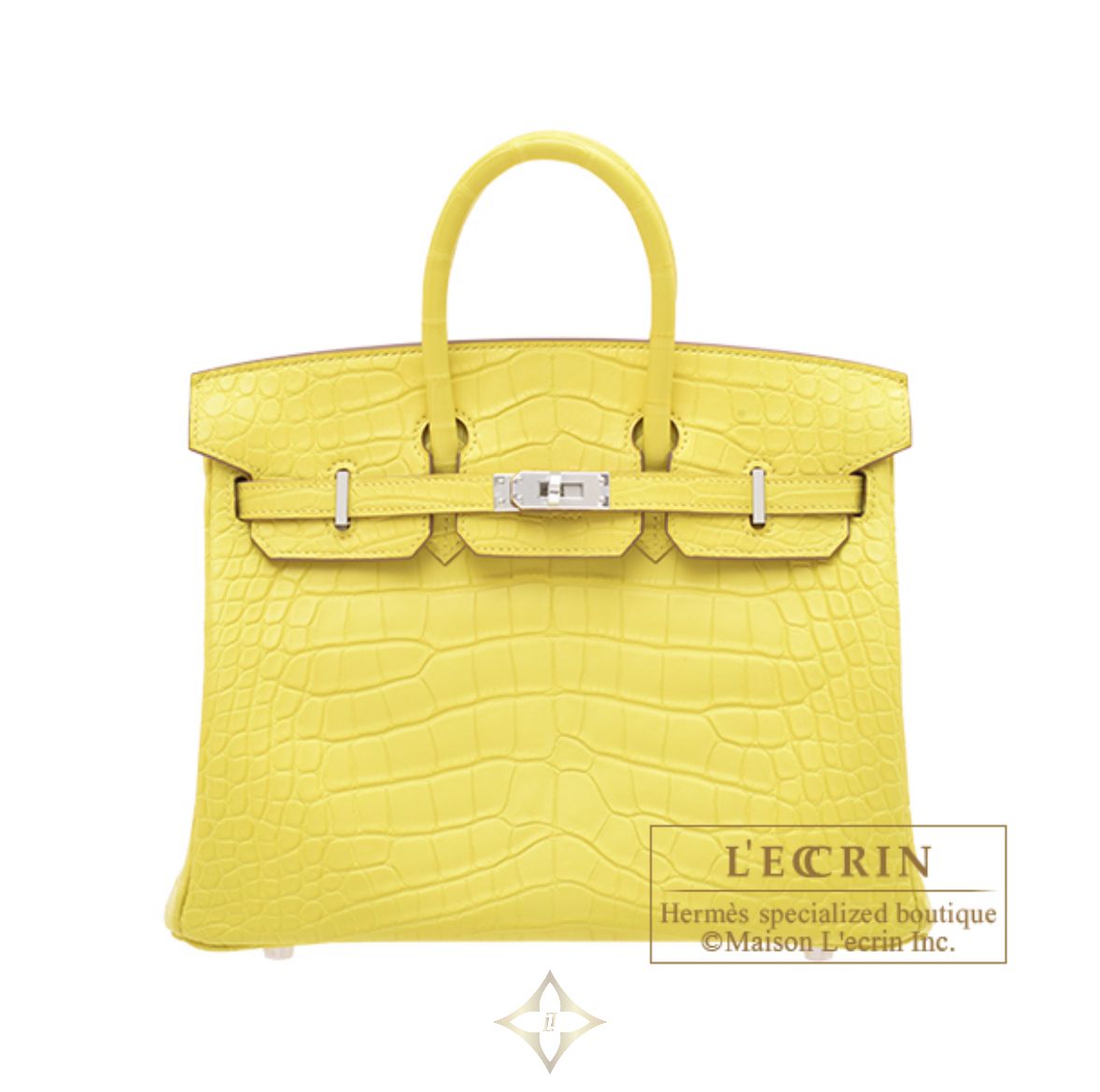 Hermes Birkin bag 25 Lime Matt alligator crocodile skin Silver hardware Product code : msbk3607601 JPY 10,989,000 DESCRIPTION Tax not included :9,990,000JPY Model :HERMES BIRKIN 25 Color :Lime/Lime yellow Material :Matt alligator crocodile skin Hardware :Silver Measurements :(W)25×(H)20×(D)13cm Accompanied by the original Hermes :Padlock, Key, Box, Cotton bag L'ecrin 3-21-3 Nishiazabu, Minato-ku, Tokyo 106-0031 WhatsApp: +81 80-8742-3162 Email: info@lecrin.jp L’ecrin Boutique Tokyo(Nishi-Azabu) L'ecrin Boutique Tokyo From overseas: +81-3-3478-7750 3-21-3 Nishiazabu, Minato-ku, Tokyo 106-0031 Singapore L'ecrin Boutique Singapore +65 6883 1161 Palais Renaissance 390 Orchard Rd, Singapore 238871 Maison L’ecrin Inc. Main Office Roppongi Hills Crosspoint 8F, 6-3-1 Roppongi, Minato-ku, Tokyo 106-0032, Japan
