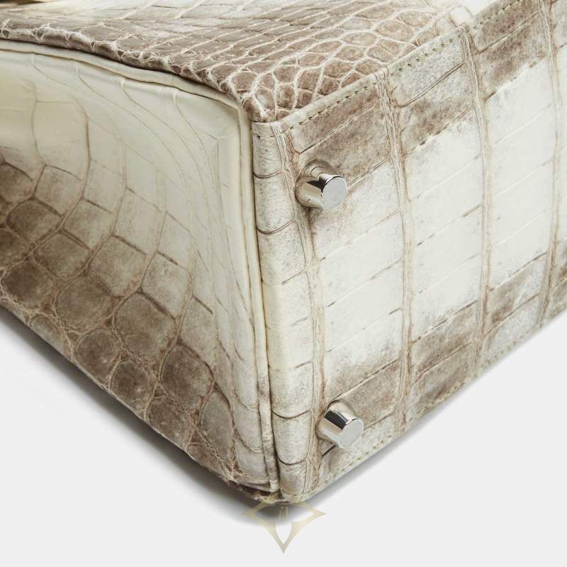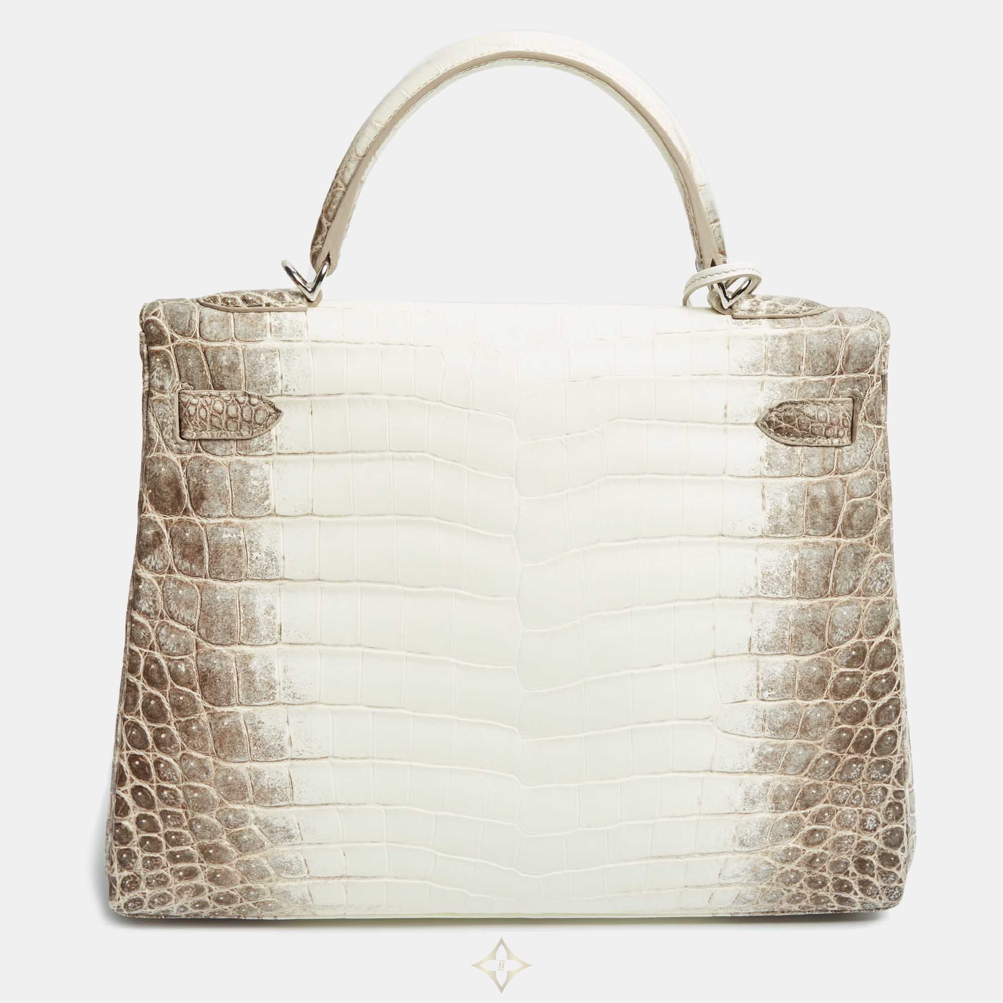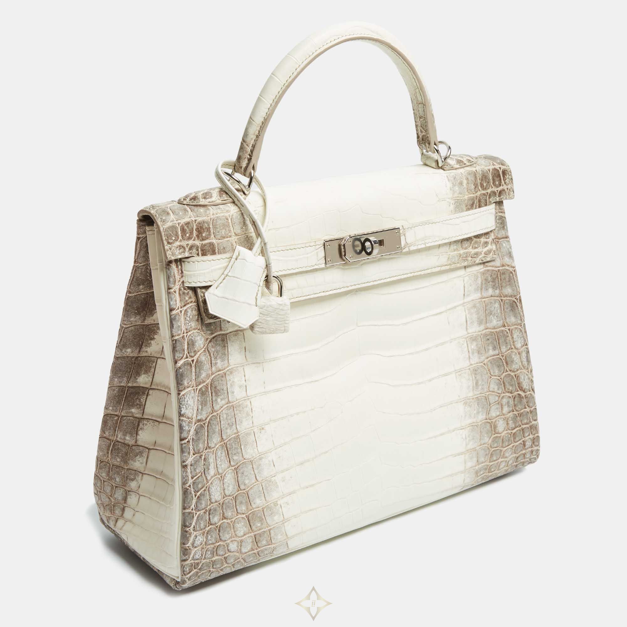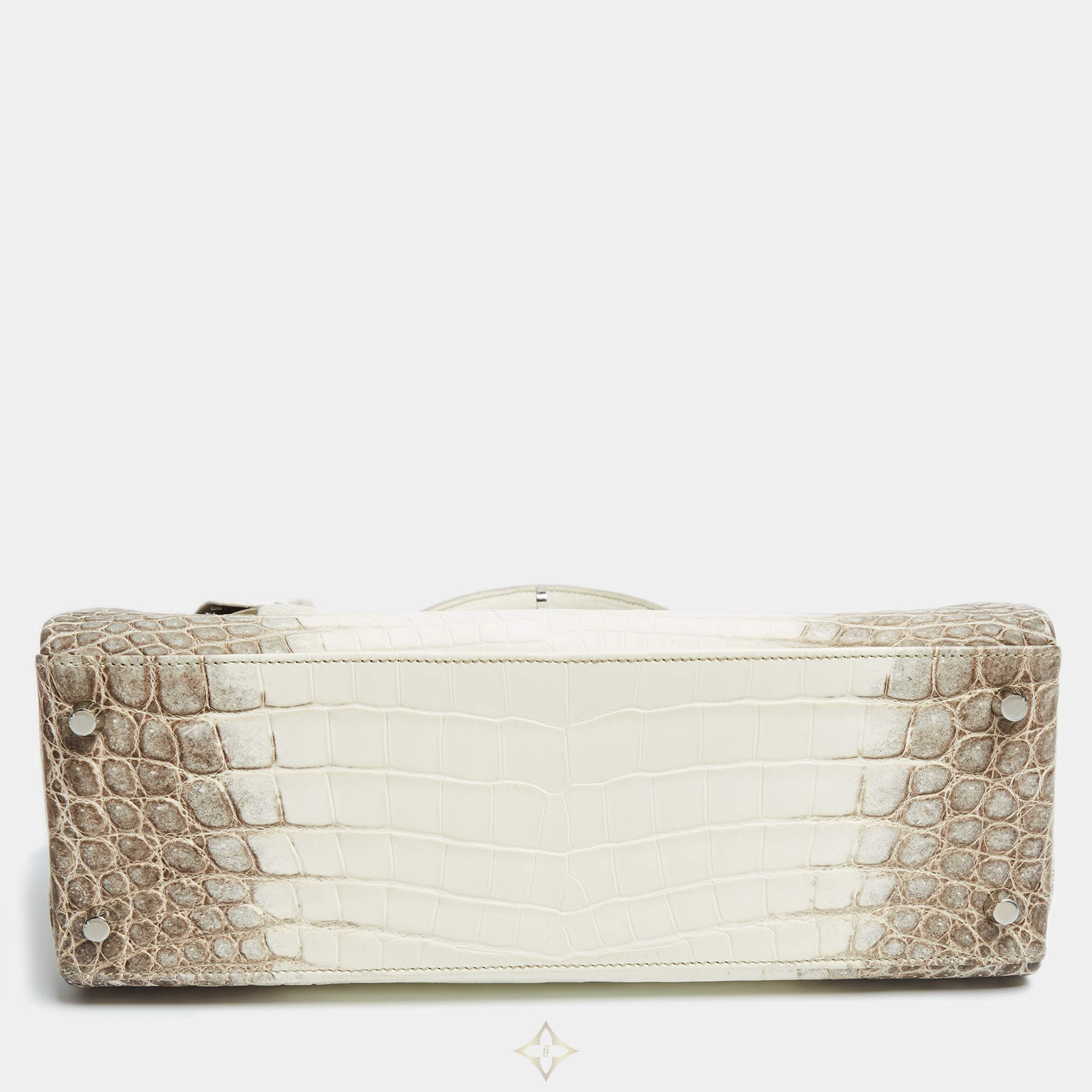 Well-believed to be one of the rarest bags in the world, the Himalaya Kelly is created by Hermès in very limited numbers. Both the Himalaya Birkin and Kelly are instantly recognized for their look rather than their shape. The term 'Himalaya' refers to the color gradation. It takes a painstaking amount of hours to dye crocodile leather and even more to particularly achieve the fading shades on the bags—a detail meant to bring alive visions of the snow-tipped Himalayas. This Himalaya Kelly Retourne 32 comes in Niloticus crocodile leather and palladium-finish hardware. Made in France, the bag has the signature twist lock on the front, a top handle, and protective studs on the base. The use of exotic material with a meticulous design process heralds the bag to what it is. You will find that this Kelly Retourne's beauty is not just in its construction and rarity but also in its increasing investment value.